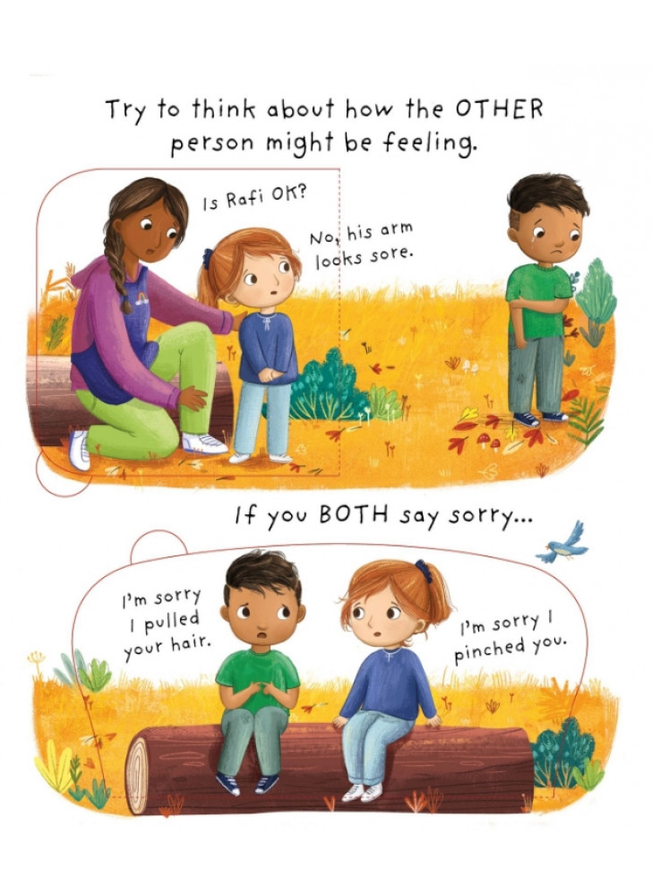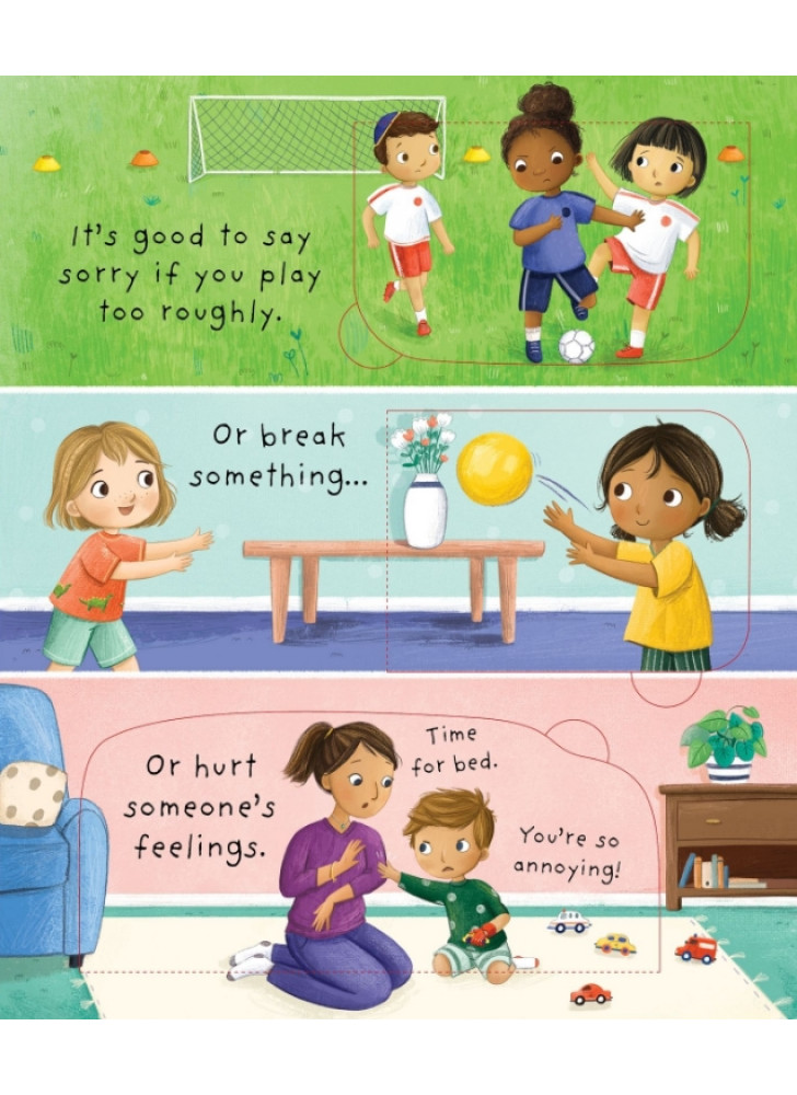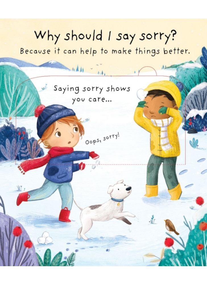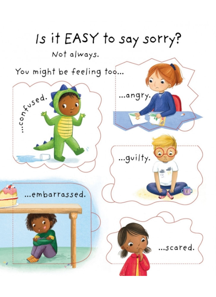 Ця книжка з відкидними сторінками за допомогою м’якого гумору, чарівних персонажів і вдало змальованих життєвих ситуацій досліджує силу вибачення — коли варто вибачатися і як робити це щиро.