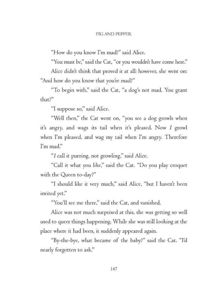 У центрі книжки - допитлива, кмітлива Аліса, і читачі не тільки наново відкриють для себе таких персонажів, як чарівний Білий Кролик, грізна Чирвова Королева, Божевільний Капелюшник та Чеширський Кіт, а й знайдуть свіжі та чудові образи цих героїв, створені справжнім майстром своєї справи; образи, що житимуть у наших серцях та умах ще багато поколінь.