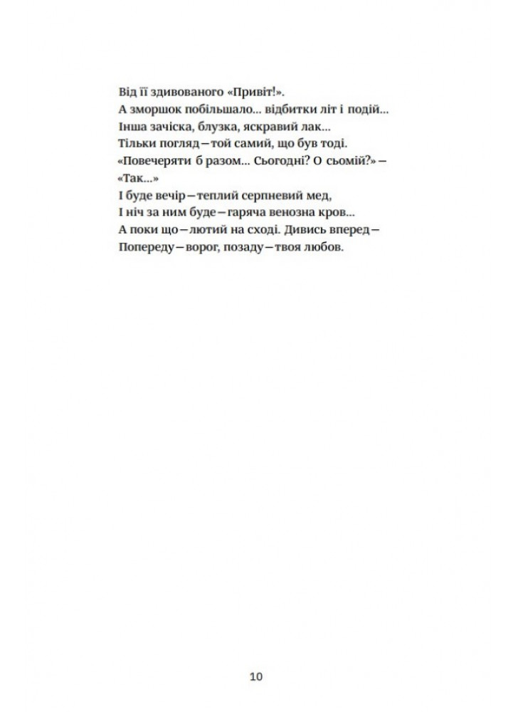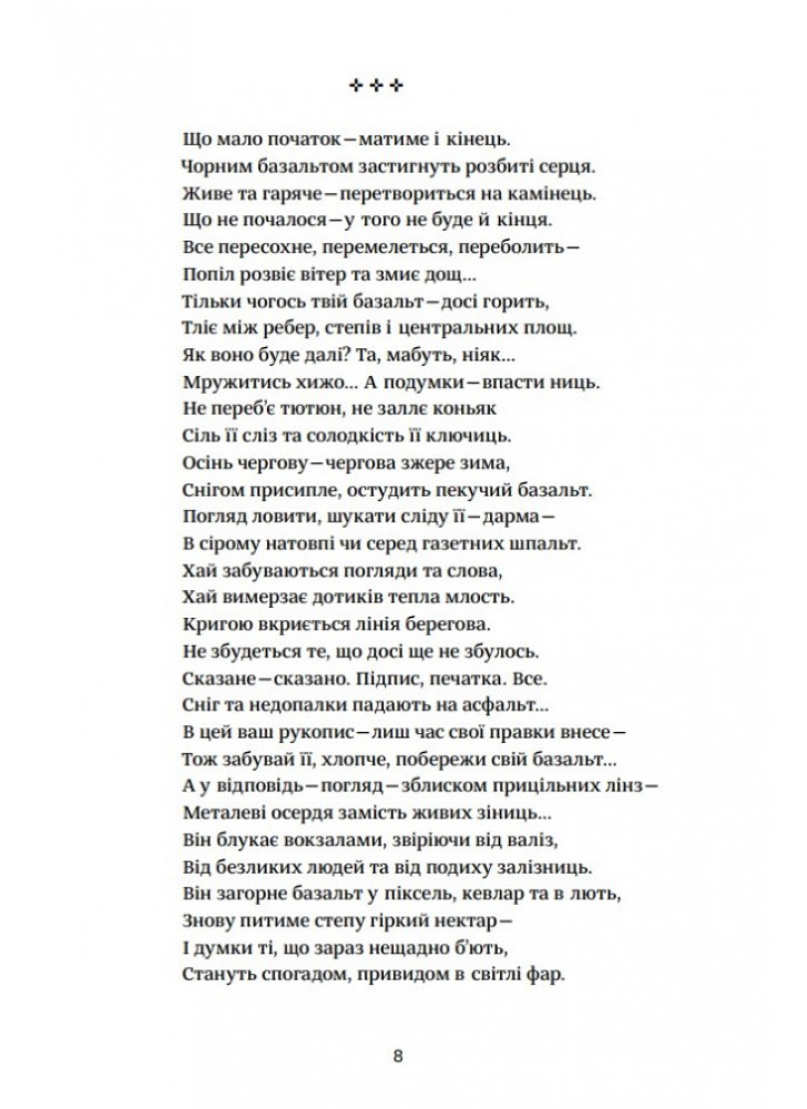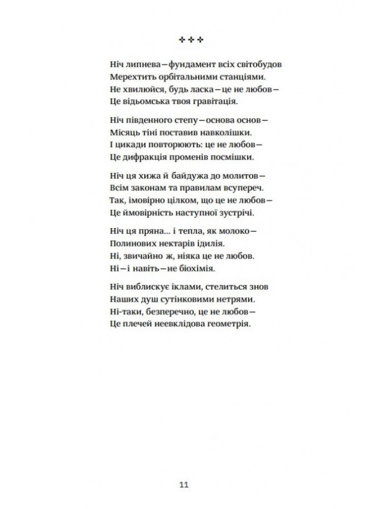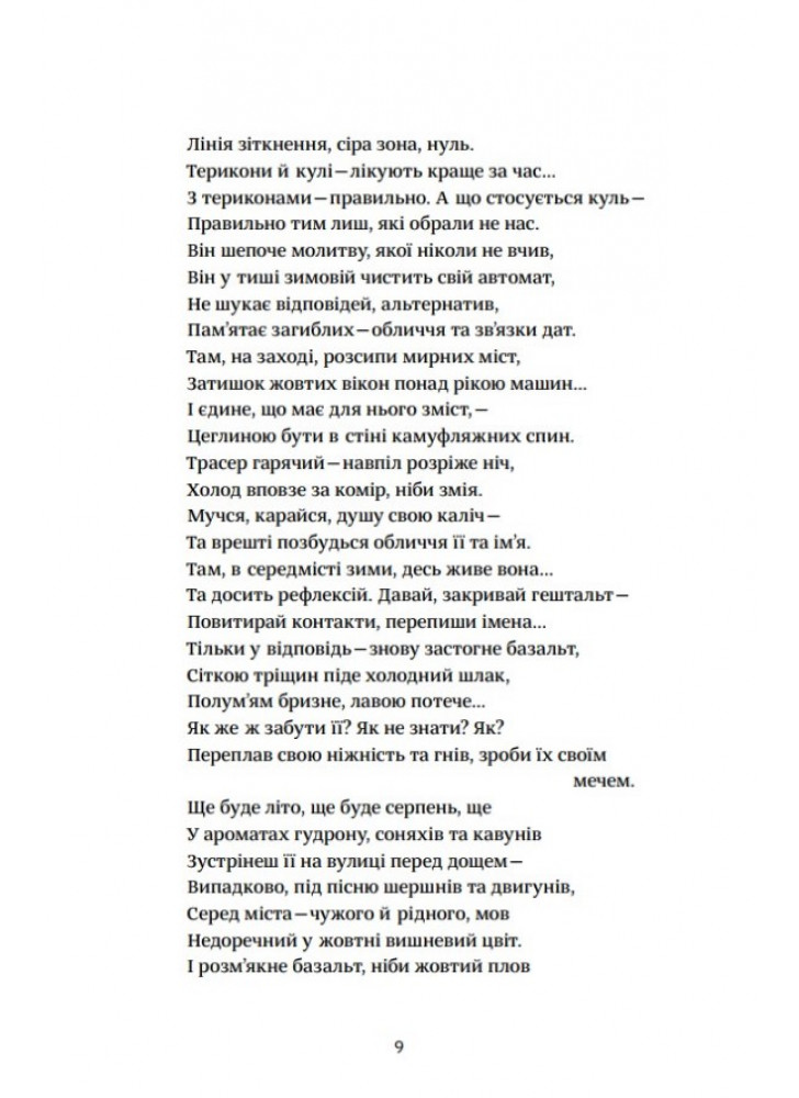Збірка складається з чотирьох розділів. Три блоки поезій: «Любов», «Війна» та «Суб’єктивна реальність».