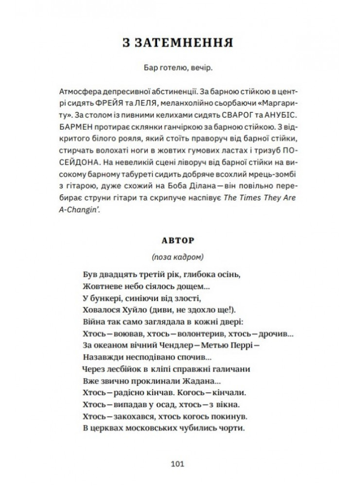 Четвертий розділ збірки — це фантасмагорична, але водночас соціально-реалістична п’єса про прадавніх забутих богів та їхні (й не тільки їхні) пригоди у нашій з вами реальності. Однак поділ на розділи досить умовний. Адже теми любові, війни та реальності тісно сплетені у тугий, вібруючий джгут почуттів та відчуттів, образів та сенсів, алегорій та алюзій, метафор, тригерів та больових точок…