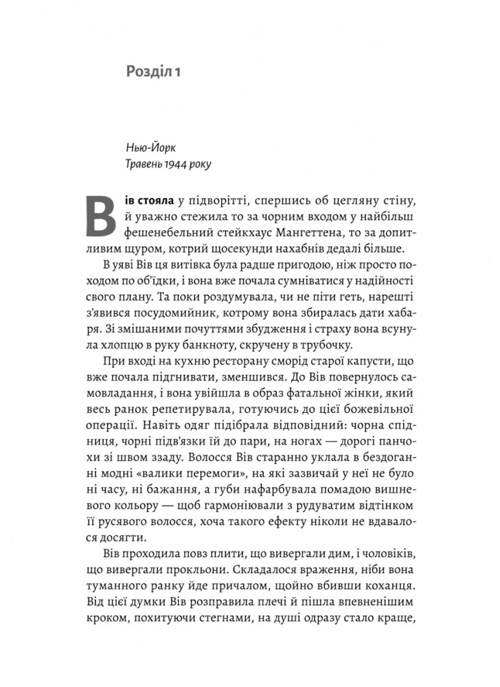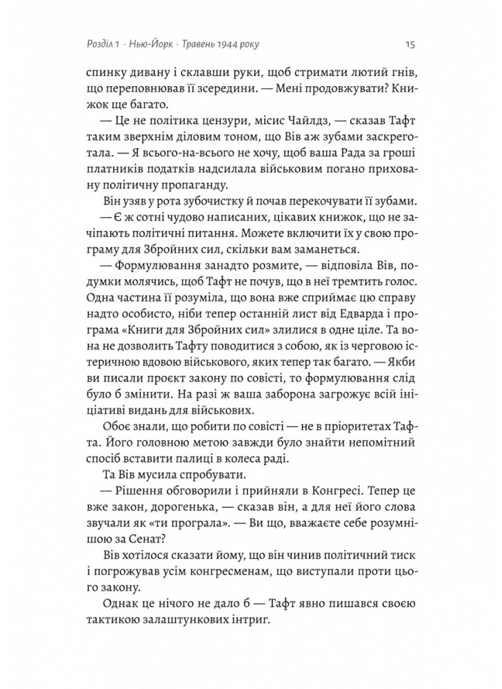 Нью-Йорк, 1944 рік. Після загибелі чоловіка в бою з нацистами, Вів’єн розпочинає власну війну: запобігає спробам впливового сенатора ввести цензуру на «Армійські видання» — кишенькові книжечки в м'якій обкладинці, які мільйонами відправляють солдатам за кордон. Вона знає, як багато вони означають для солдатів, і єдиний спосіб виграти цю битву — протиставити пропаганді сенатора власну історію — історію таємничої жінки-самітниці, яка доглядає за Американською бібліотекою заборонених книг у Брукліні. Коли Вів вступає у боротьбу з цензурою і занурюється у таємниці недавнього минулого, долі цих трьох жінок перетинаються…