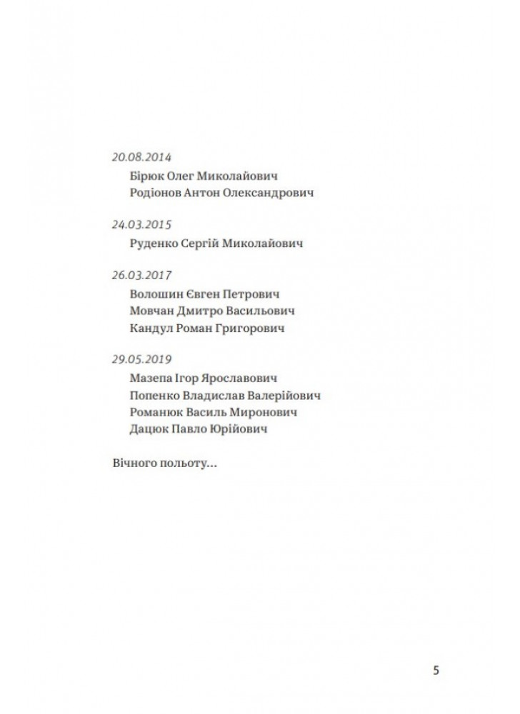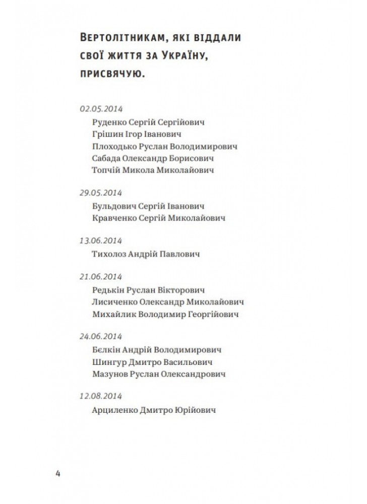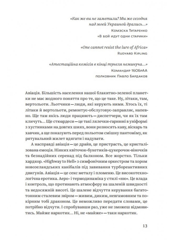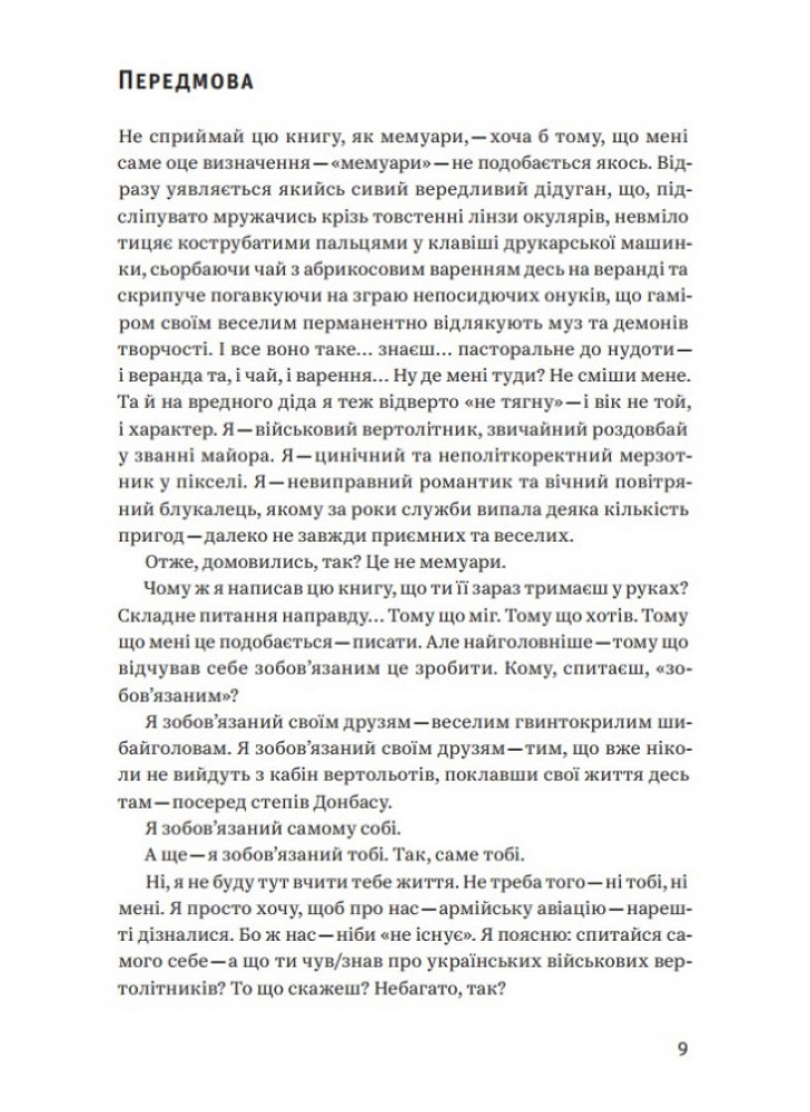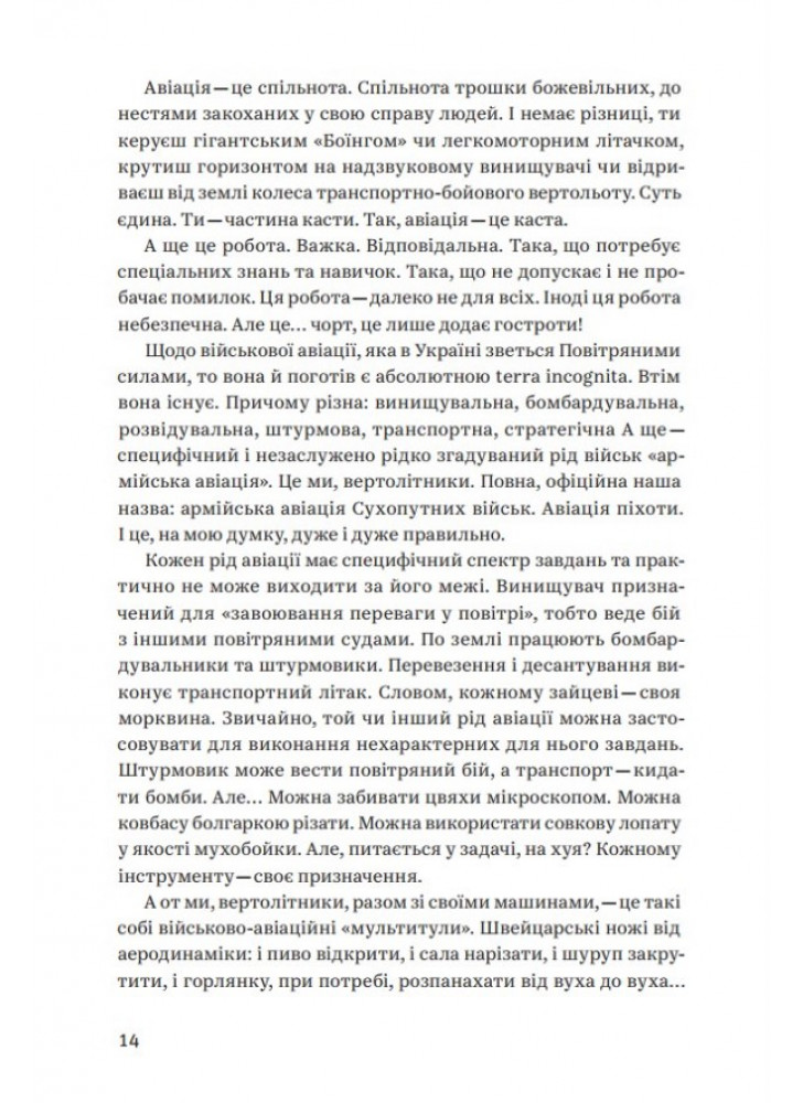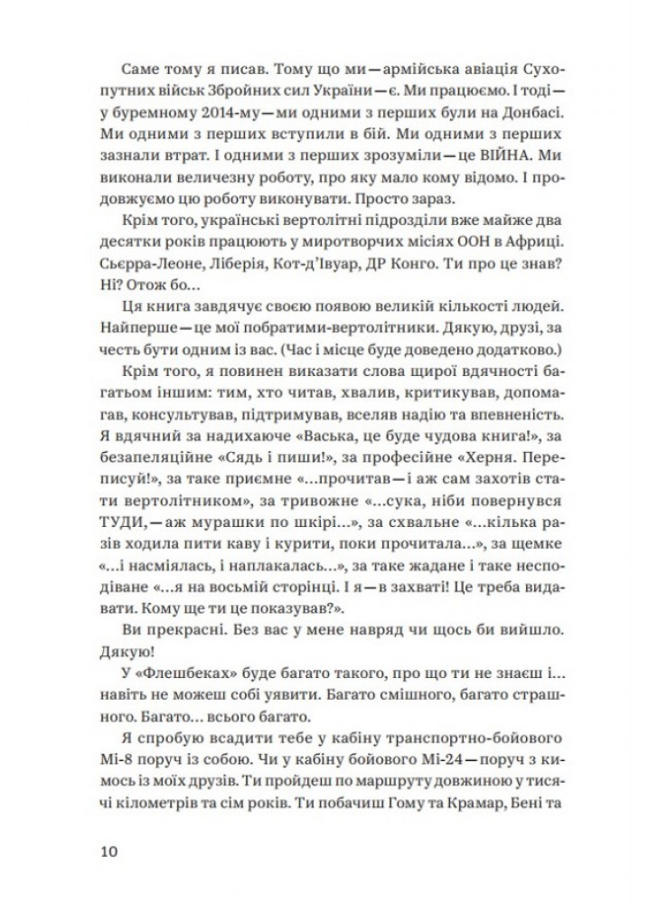 Їхні життя, їхня служба, їхня робота. Їхні емоції, надії та страхи. Їхня вірність своїм та ненависть до ворога. Їхні злети та падіння — у прямому сенсі. Терикони та вулкани. Степи та джунглі. Очима безпосереднього учасника подій. Драйв польоту та жах війни. Ревіння турбін. Свист гвинтів. Димні хвости некерованих ракет. А ще гумор — саркастичний, солоний, авіаційний. Це не спогади, не щоденник, не мемуари. Це — флешбеки. Гвинтокрилі флешбеки.