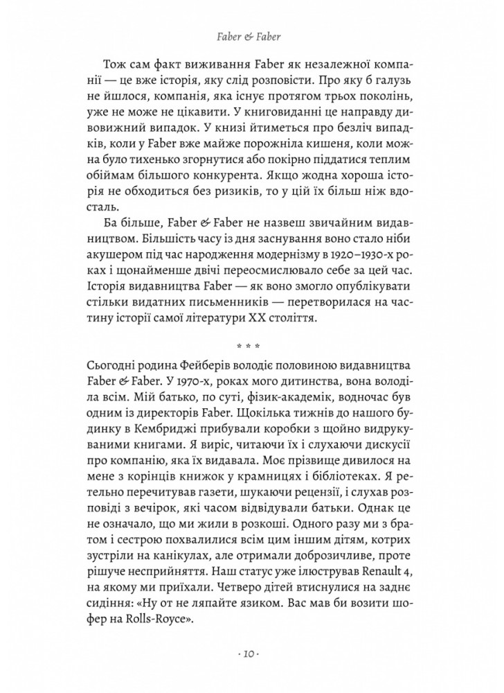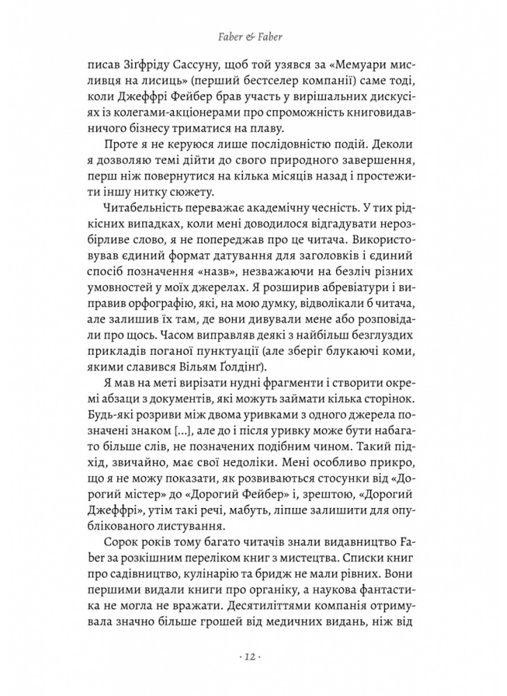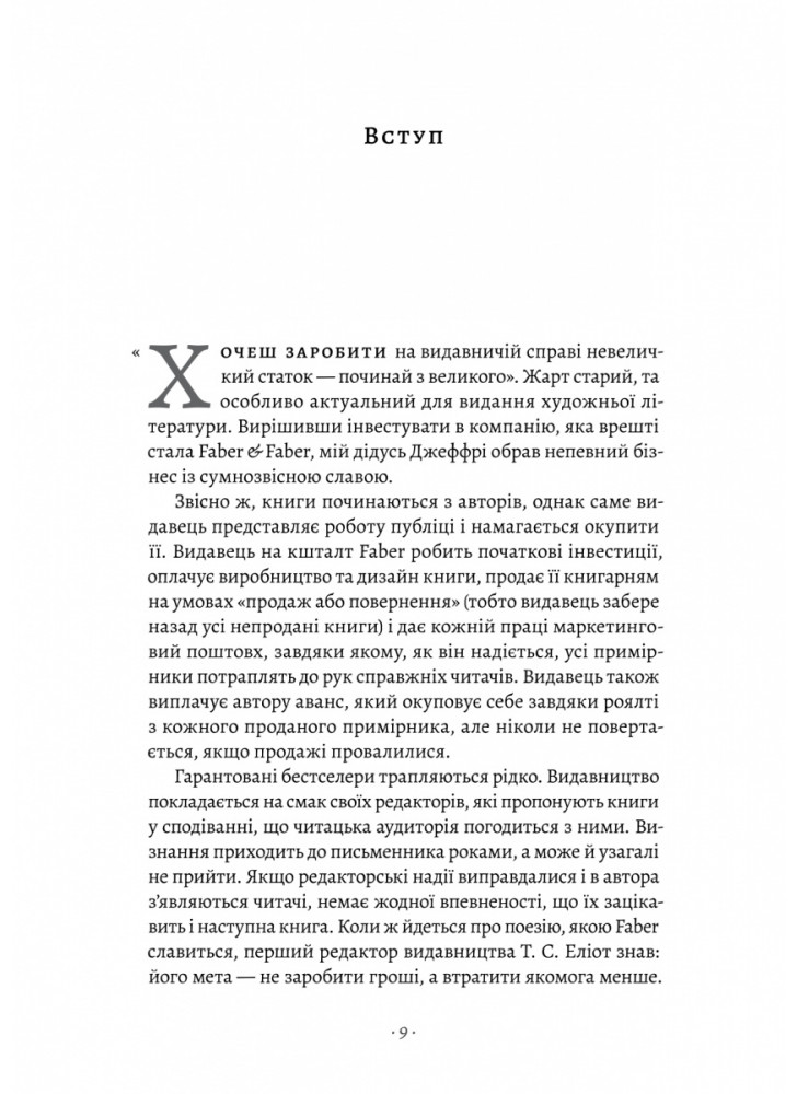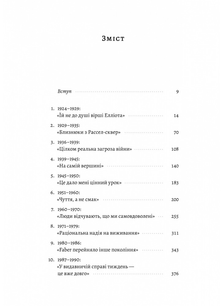 Читацькі нотатки Томаса Еліота, лайка і цензура у творчості Семюела Беккета, відмова від «Колгоспу тварин» Джорджа Орвелла, відкриття талантів Кадзуо Ішіґуро, Вільяма Ґолдінґа, Сильвії Плат та інших літературних суперзірок — все це синоніми видавництва Faber & Faber, заснованого у 1929 році в Блумзбері. Але як їх вдалось об’єднати і що насправді відбувалось за лаштунками маленької фірми, яка попри нестачі паперу, період Великої депресії й фінансові кризи, стала одним із найбільших незалежних видавництв у світі, що утримує свою першість і донині?