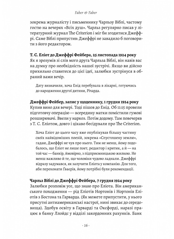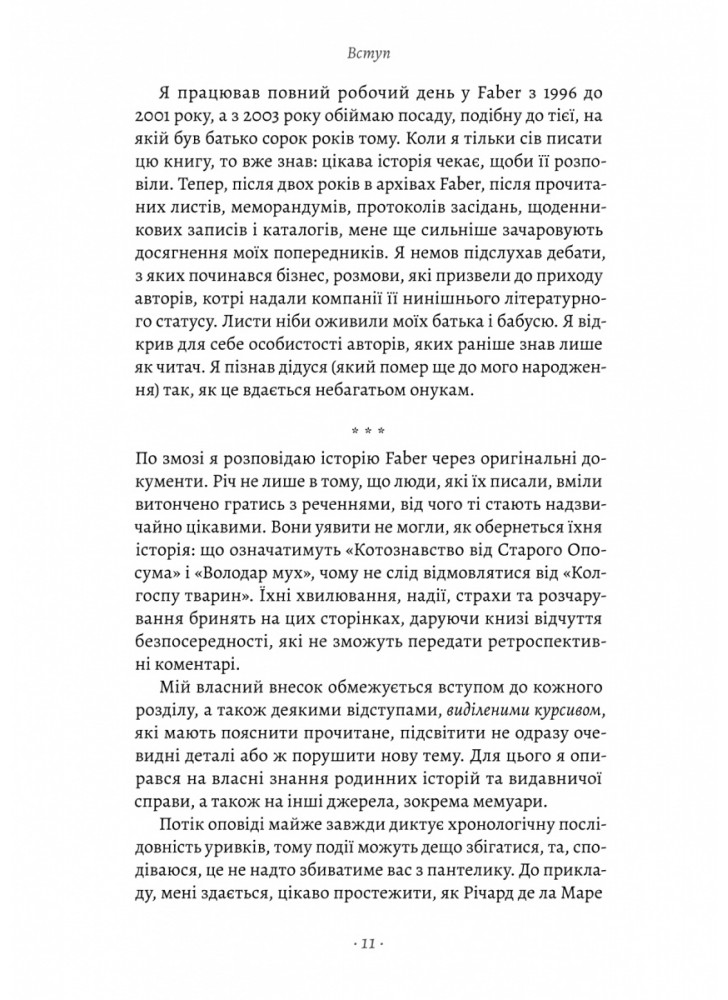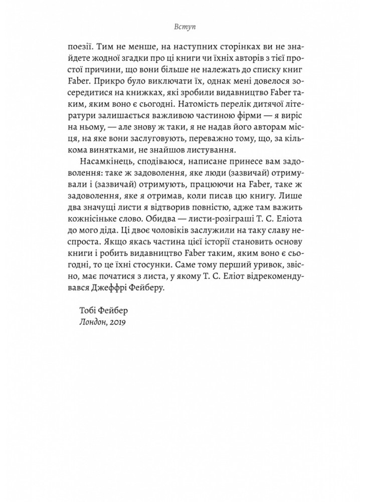 - Інтимна історія видавництва Faber, сплетена з найцікавіших, найзворушливіших і найдивовижніших листів, щоденників і матеріалів з архіву, розкриває нерозказані досі історії найвидатніших літературних творів, поетів і письменників ХХ століття.