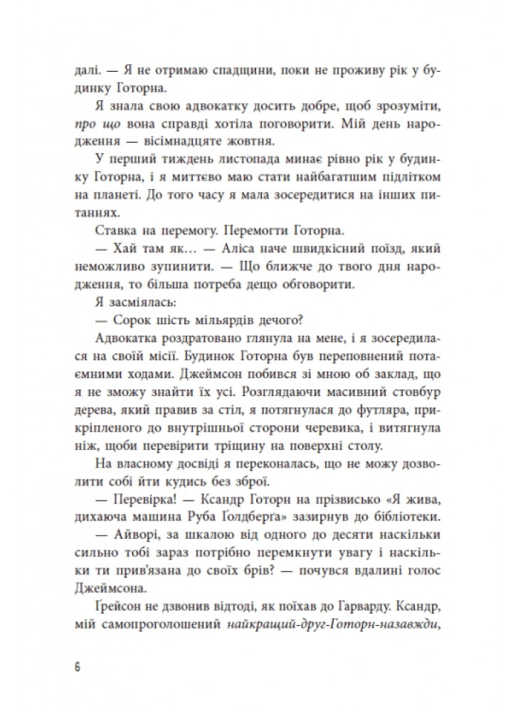 У третій частині циклу «Ігри спадкоємців» неперевершеної майстрині загадок і несподіваних сюжетних поворотів Дженніфер Лінн Барнс — любов, кров і величезні статки! Рік у будинку Готорна добігає кінця, але клубок давніх таємниць, зрад і злочинів, що має розплутати Айворі, сплітається ще тугіше. На кону життя знайденої та знову втраченої рідної людини.