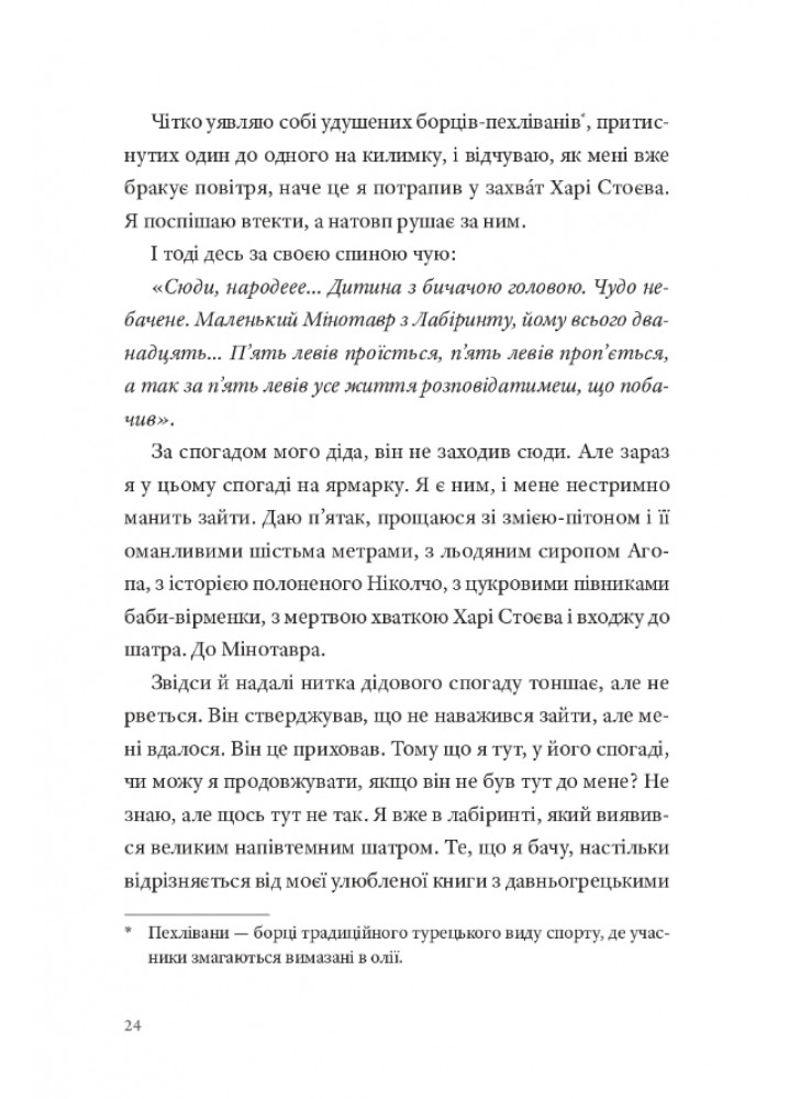Усе починається невинно: хлопчик потрапляє на ярмарок, стискаючи в долоні монету, яку отримав від батька. В одному з наметів він бачить Мінотавра — істоту, яка надовго позбавить його мови і спокою. Цей ні на що не схожий роман є дослідженням лабіринту: місця, де ми блукаємо і знаходимо себе, місця, де натрапляємо на найнеймовірніші (і зовсім звичайні) історії, місця, де врешті-решт доходимо до Мінотавра — створіння, яке цілком може виявитися нами самими багато років тому.