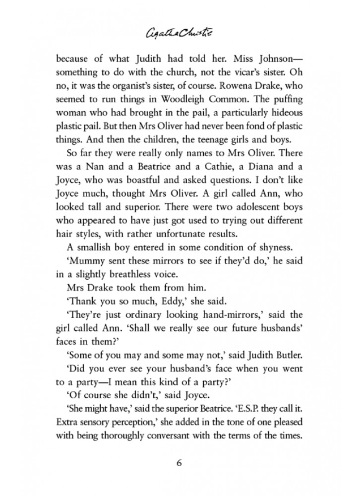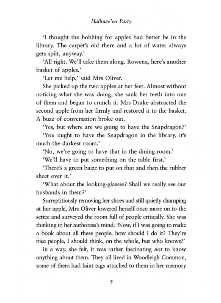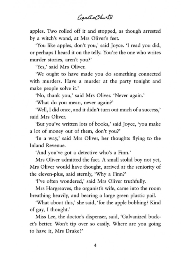 Коли їй не вірять, вона сердито йде додому. Та вже за кілька годин її знаходять мертвою — утоплену в діжці для гри в «яблука в воді». Тієї ж ночі викликають Еркюля Пуаро, аби знайти «зловісну присутність». Але спершу йому доведеться з’ясувати: він має справу з одним убивством… чи з двома?