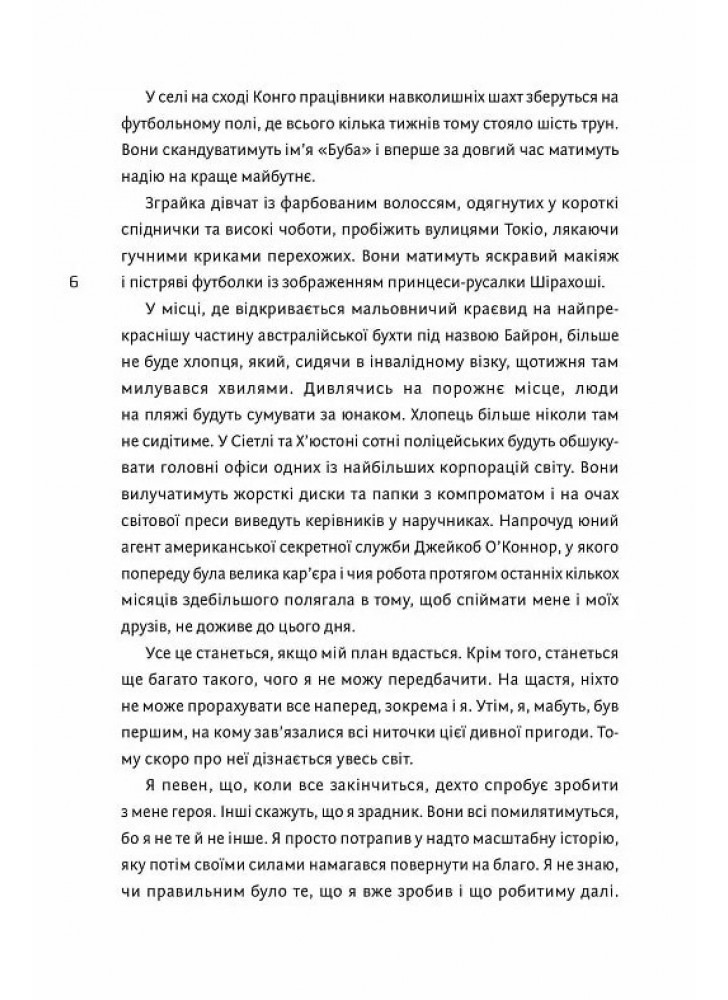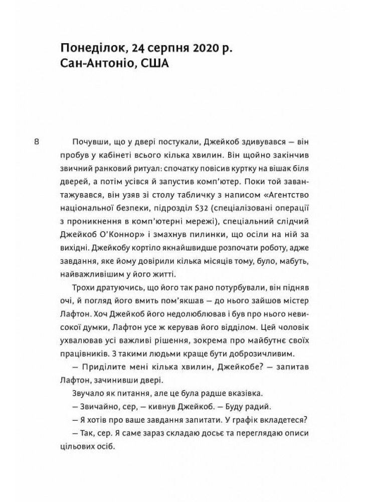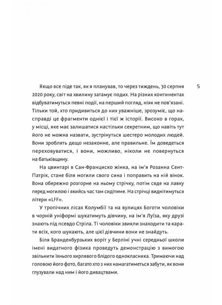 «Якщо все піде так, як я планував, то через тиждень, 30 серпня 2020 року, світ на хвилину затамує подих. На різних континентах відбуватимуться певні події, на перший погляд, ніяк не пов'язані. Тільки той, хто придивиться до них уважніше, зрозуміє, що насправді це фрагменти однієї й тієї ж історії».
