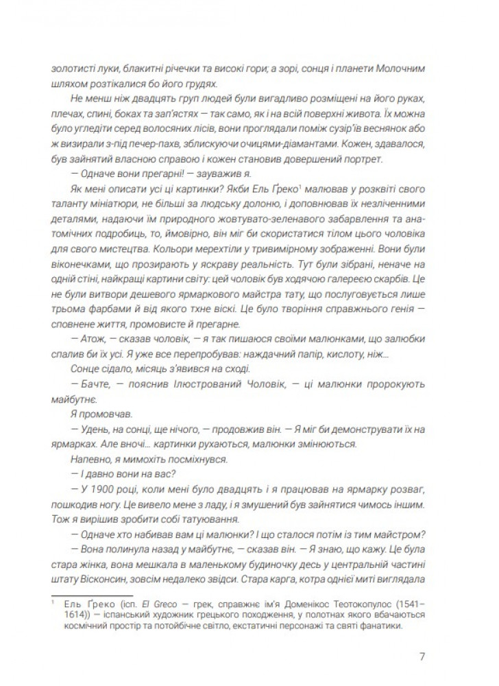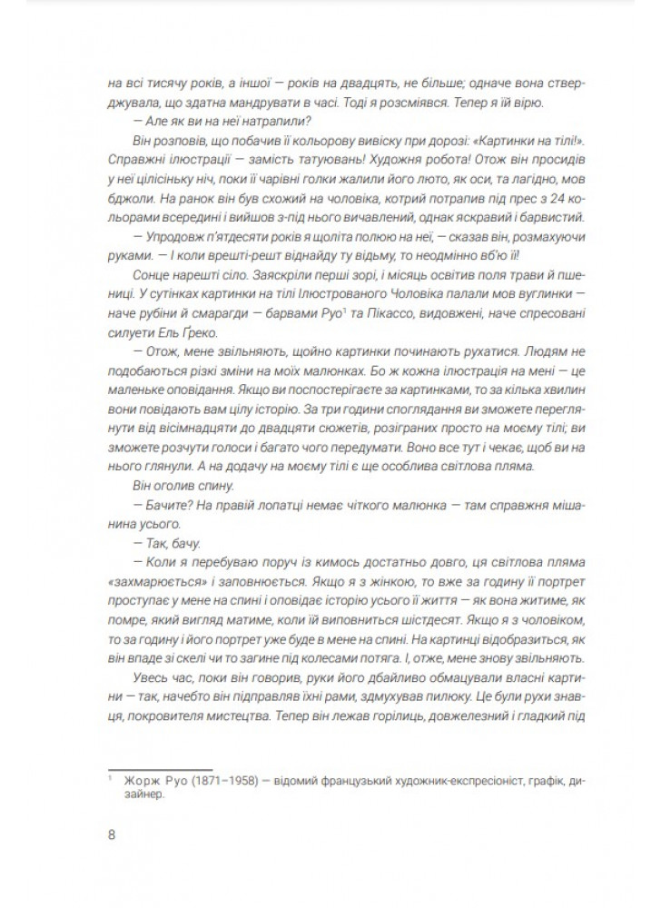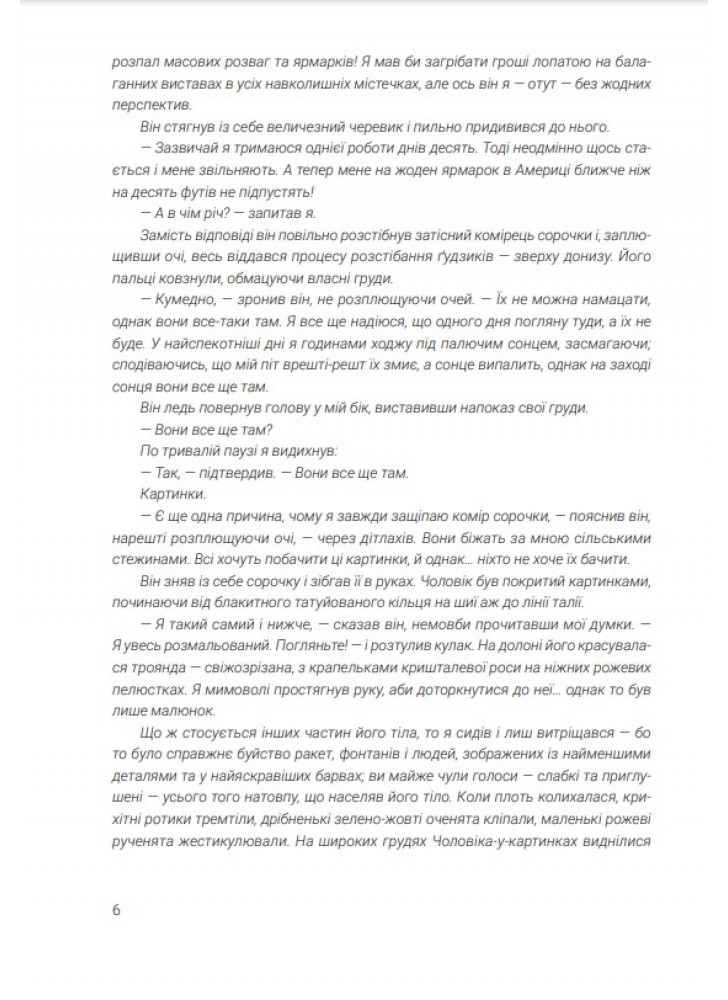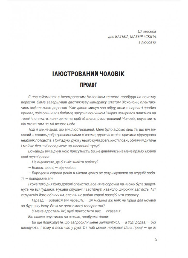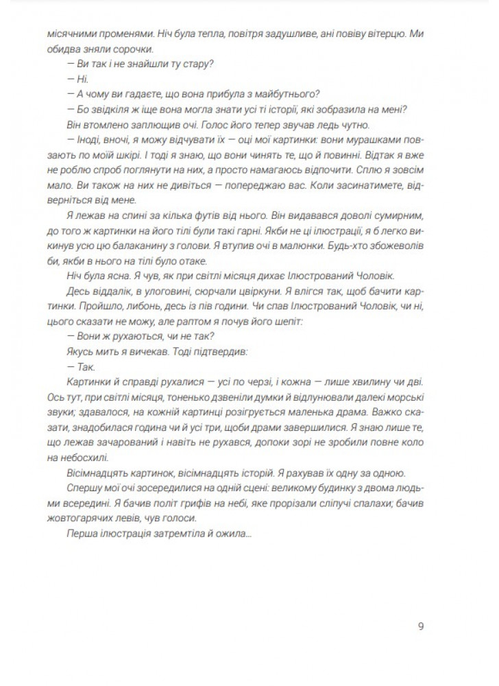«Ілюстрований Чоловік» — це калейдоскопічне поєднання дивовижного, фантастичного і реального. Оповідання збірки разом із моторошно-жахним епілогом створюють ілюзію завершеної й цілісної повісті. Уперше перекладена українською мовою, ця книга свого часу набула неабиякого розголосу, ба більше — надихнула на створення фільмів, рок-опер, серіалів та знакових пісень.