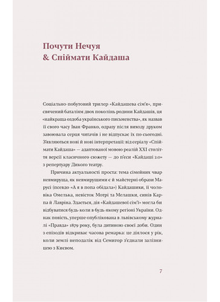 Тема сімейних чвар невмируща. Дія «Кайдашевої сім’ї», здається, могла відбуватися будь-коли в будь-якому регіоні України. Напевно, саме тому цей твір такий живий і отримує все нові втілення — у театрі, в кіно. Яскраві описи життя, гумор і прекрасно зафіксована розмовна мова.