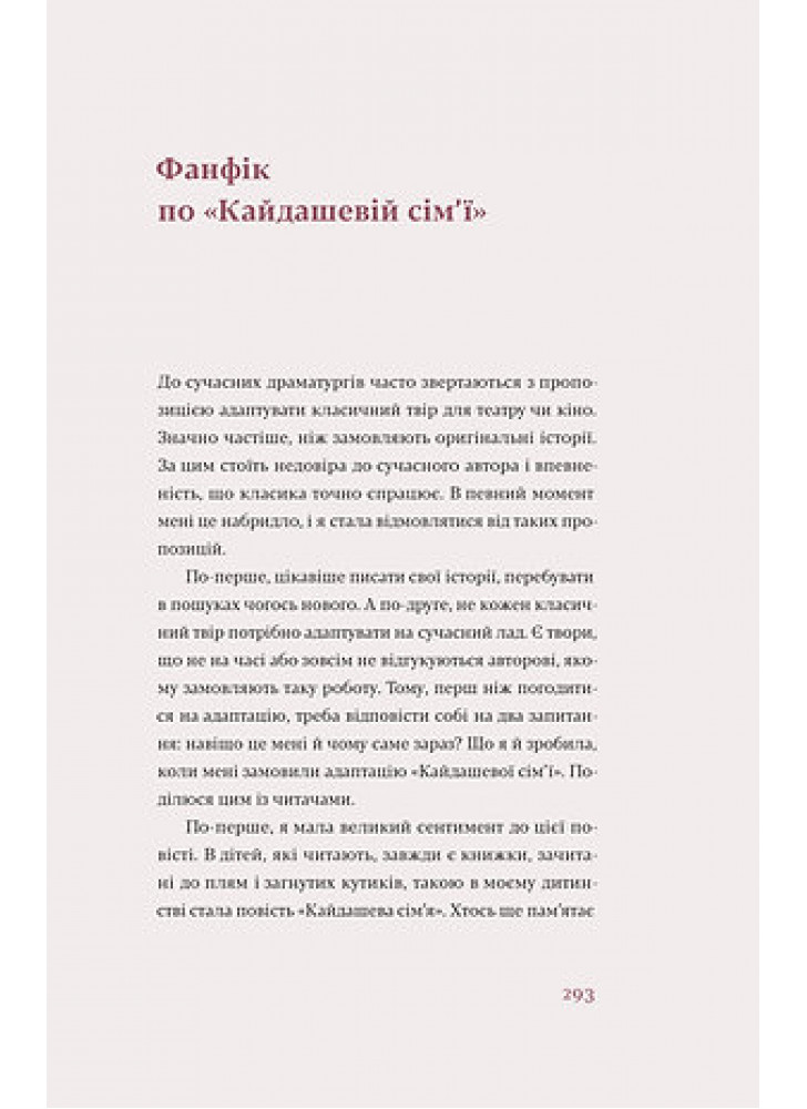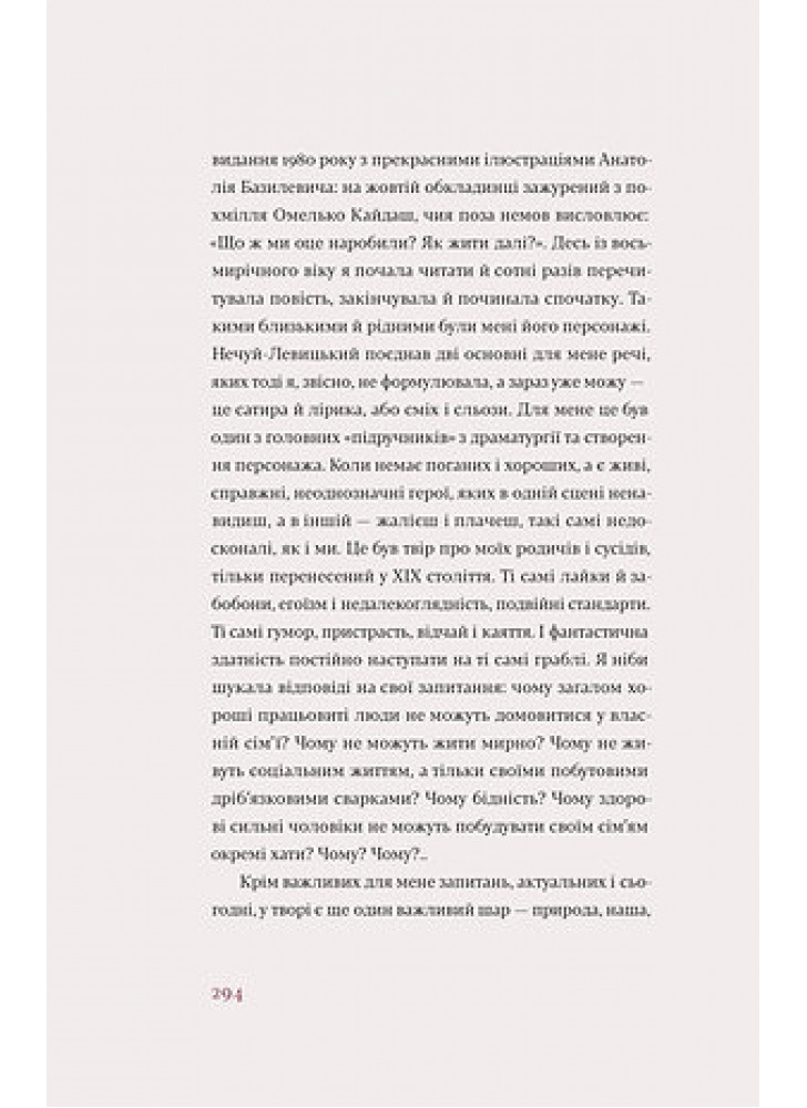 А головне, вічні персонажі, риси яких можна розпізнати навіть у ваших знайомих — брати, що, подорослішавши, не можуть знайти спільну мову й поділити майно, знервована мати, яка все своє життя присвятила догляду за сім’єю, але й контролю над нею, старий Кайдаш, що дедалі більше втрачає сенс життя і заглядає у чарку.