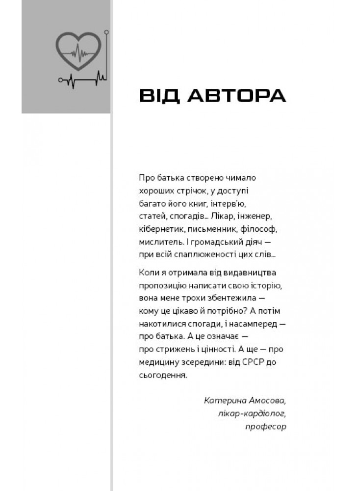 Катерина Амосова ділиться з читачами спогадами про своє дитинство й родину видатного вченого Миколи Амосова; розповідає про свій шлях до кардіології, кар’єру науковця та викладача, ректора Національного медичного університету ім. О. О. Богомольця, а також дає корисні й дієві поради, які допоможуть зберегти здоров’я серцево-судинної системи. Жива оповідь, цікаві й унікальні факти, змога зазирнути за куліси життя одного з найвідоміших не лише в Україні, а й у світі хірурга та вченого зацікавить широке коло читачів, а конкретні поради стануть у пригоді всім, хто дбає про своє здоров’я.
