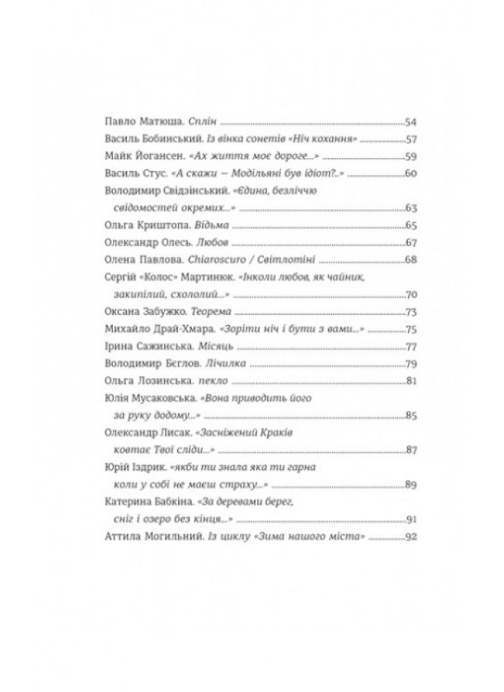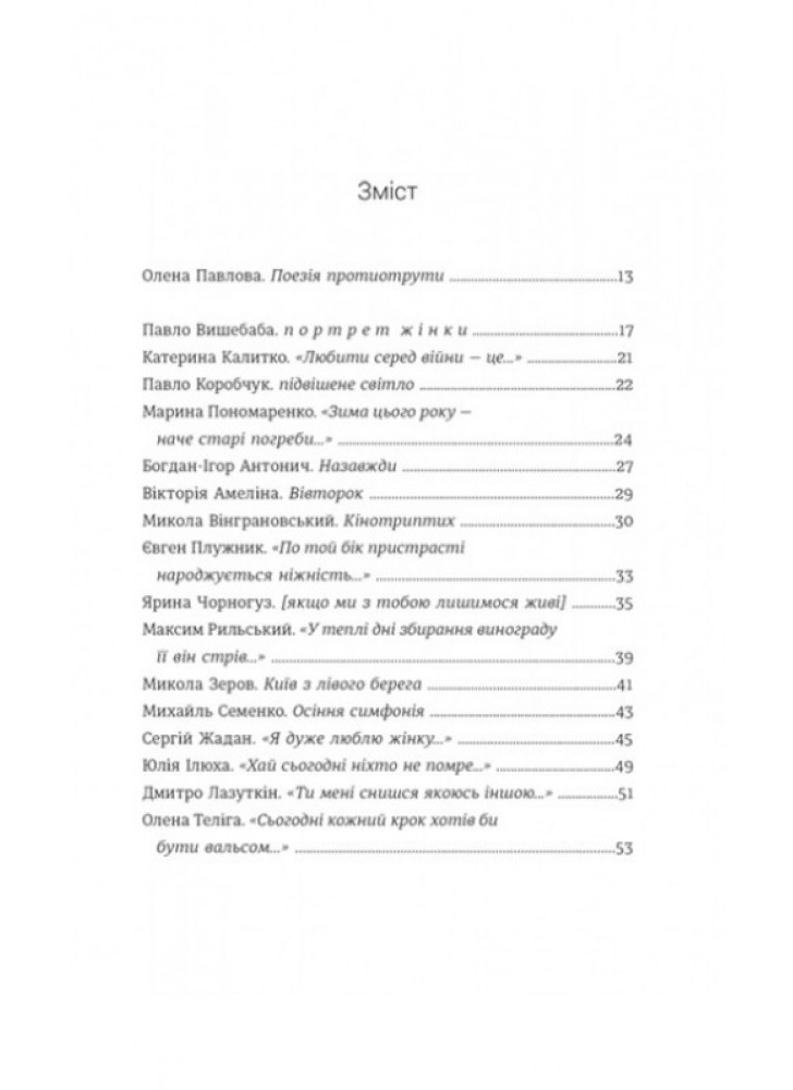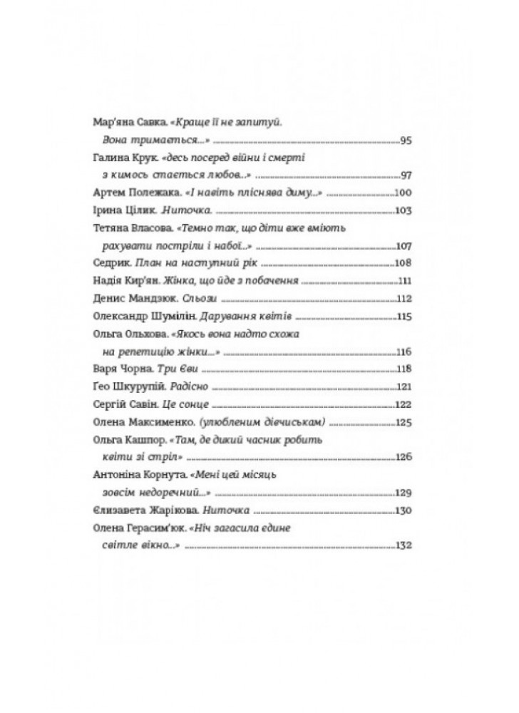 До збірки увійшли твори таких авторів та авторок: Павло Вишебаба, Катерина Калитко, Павло Коробчук, Марина Пономаренко, Вікторія Амеліна, Ярина Чорногуз, Сергій Жадан, Юлія Ілюха, Дмитро Лазуткін, Павло Матюша, Василь Стус, Ольга Криштопа, Олена Павлова, Сергій «Колос» Мартинюк, Оксана Забужко, Ірина Сажинська, Володимир Бєглов, Ольга Лозинська, Юлія Мусаковська, Олександр Лисак, Юрій Іздрик, Катерина Бабкіна, Мар’яна Савка, Галина Крук, Артем Полежака, Ірина Цілик, Тетяна Власова, Седрик, Надія Кир’ян, Денис Мандзюк, Олександр Шумілін, Ольга Ольхова, Варя Чорна, Сергій Савін, Олена Максименко, Ольга Кашпор, Антоніна Корнута, Єлизавета Жарікова, Олена Герасим’юк, Олена Шарговська, Таня-Марія Литвинюк, Анна Малігон.