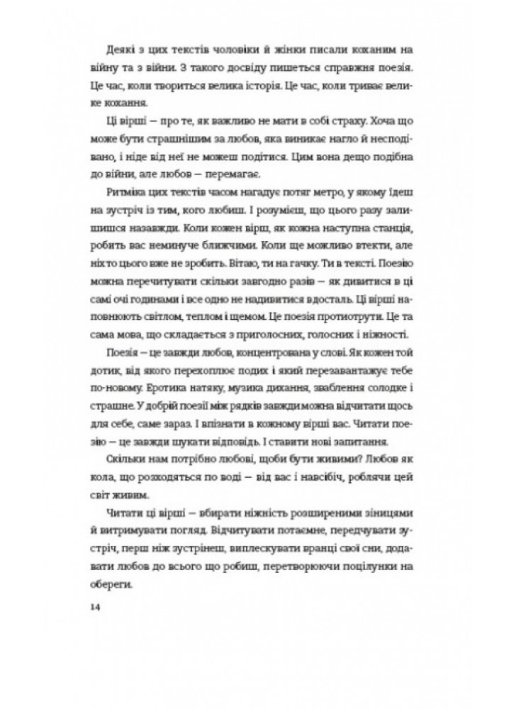 Ці вірші наповнюють світлом, теплом і щемом. Це поезія протиотрути. Це та сама мова, що складається з приголосних, голосних і ніжності. Сучасні зірки української поезії та нові імена, класики й потужний голос поетів Розстріляного Відродження, яких у нас уже ніколи не заберуть. Читати ці вірші зараз — відвойовувати свою пам’ять, право бути собою і любити. «Серед авторів цієї збірки — сучасні поети і класики, серед класиків — особлива увага поетам Розстріляного Відродження.