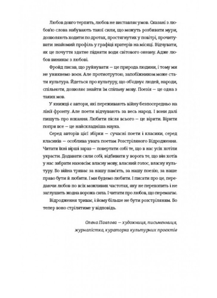 Читати їхні вірші зараз — повертати собі те, що в нас усіх хотіли украсти. Додавати сили собі, відбивати у ворога те, що він хотів у нас забрати назовсім: власну мову, власний голос, власну культуру. Бо війна триває за нашу пам’ять, за нашу поезію, за наше право бути й любити. І ми будемо любити. І писати про це, передаючи любов по всіх можливих частотах, яку не перехопить і не заглушить жодна ворожа сила. І читати про любов, що перемагає. Відродження триває, і йому більше не бути розстріляним. Бо тепер воно стрілятиме у відповідь», — упорядниця збірки Олена Павлова, художниця, письменниця, журналістка, кураторка культурних проєктів.