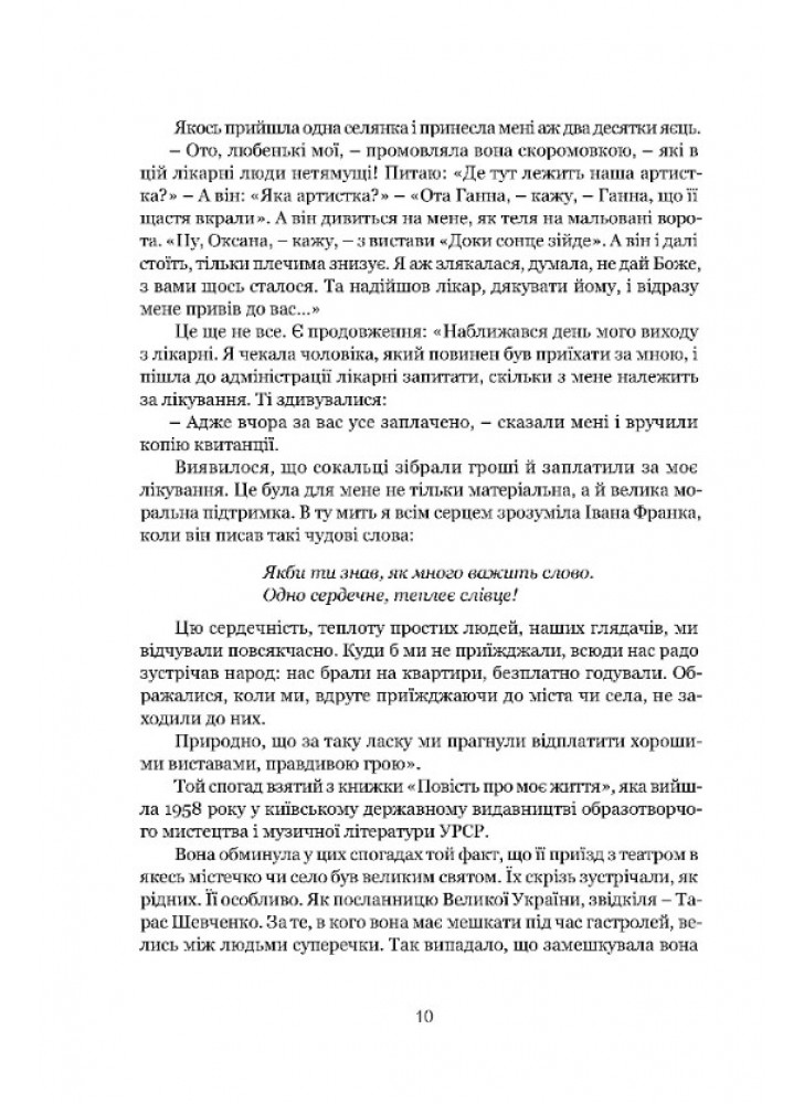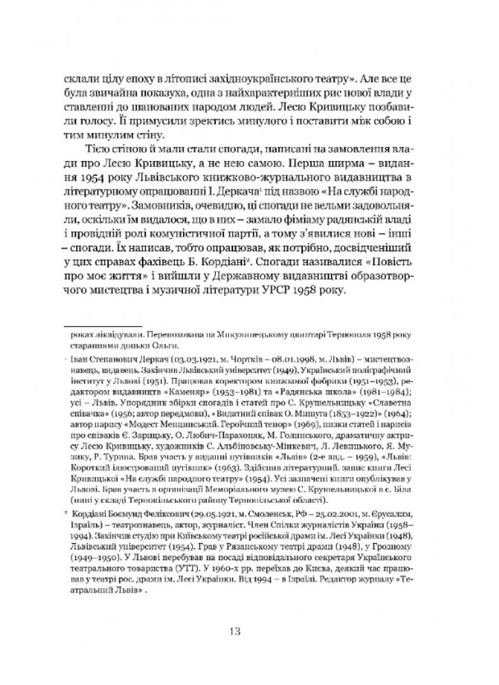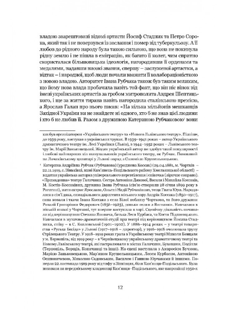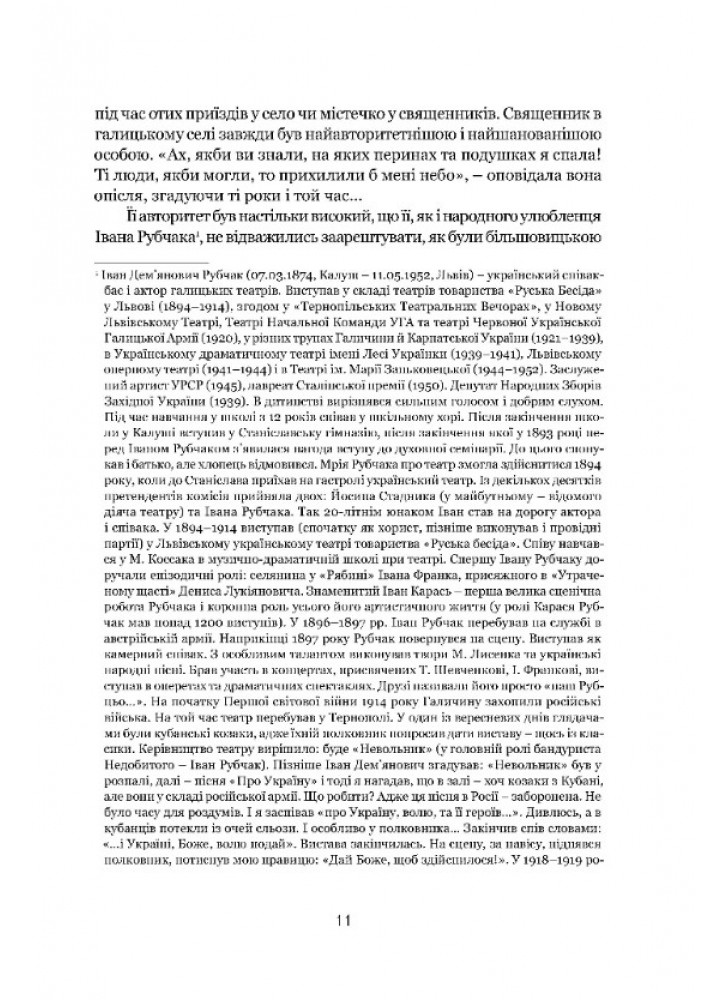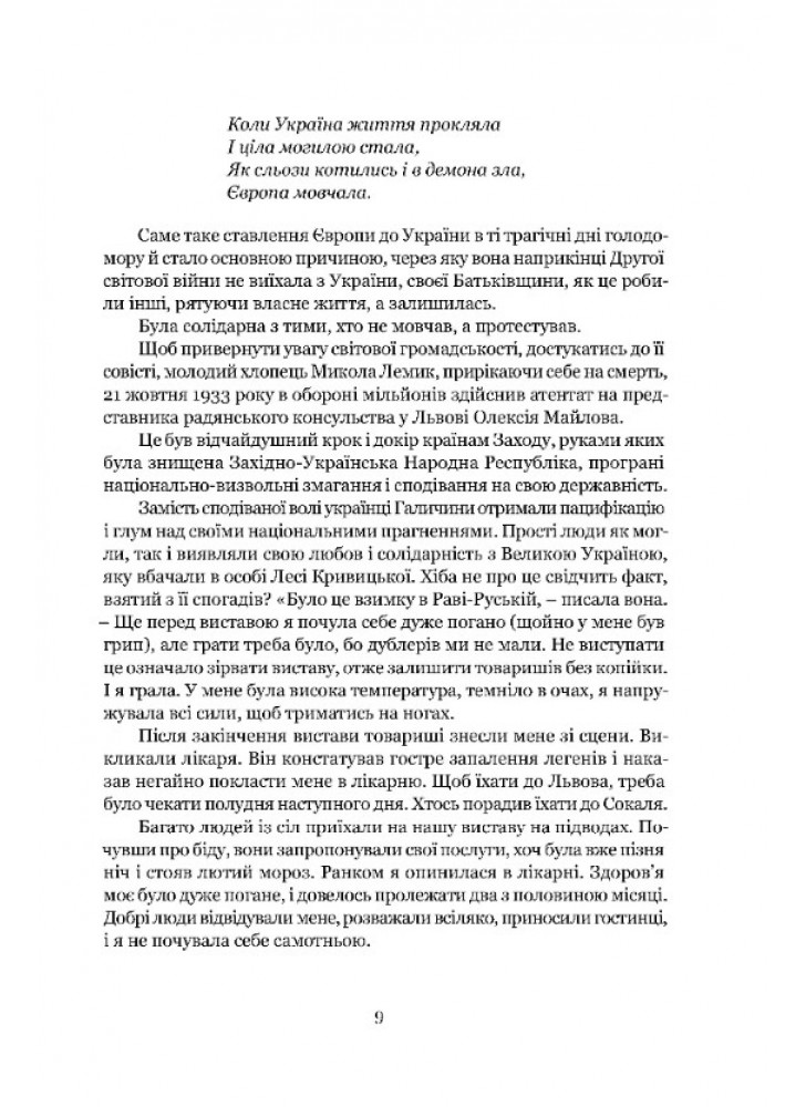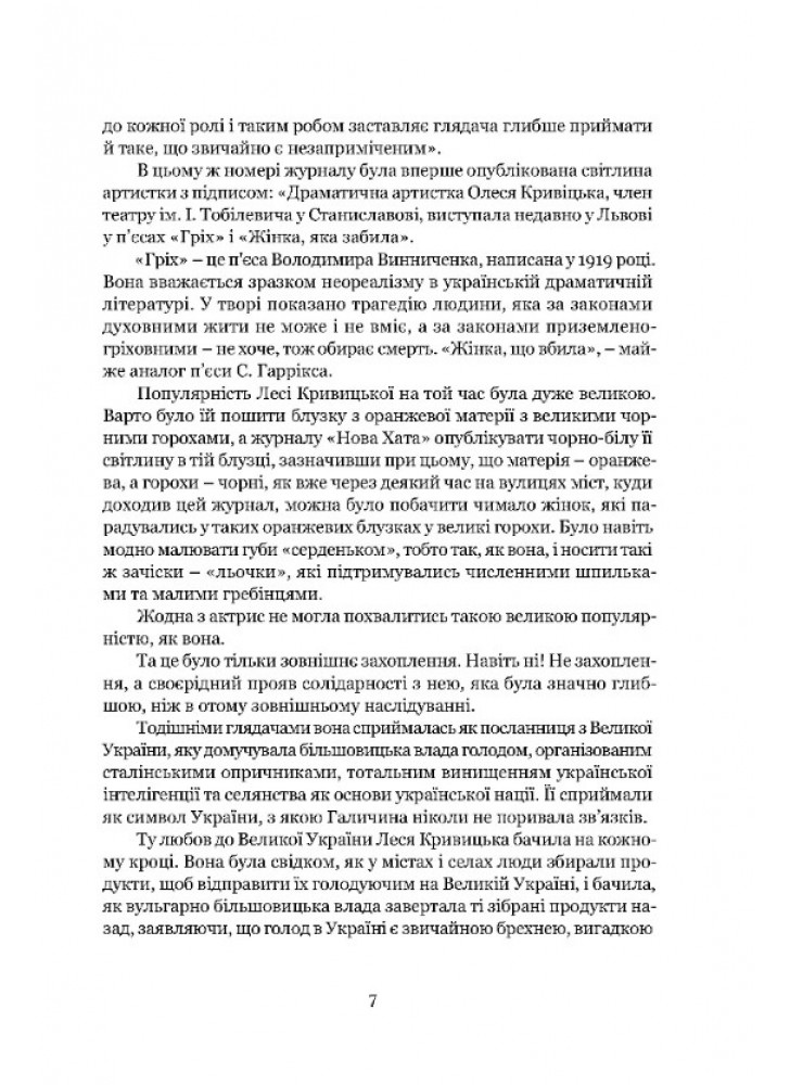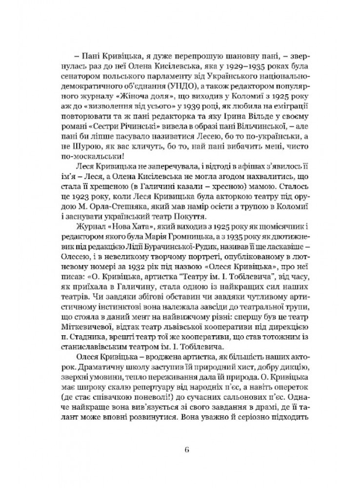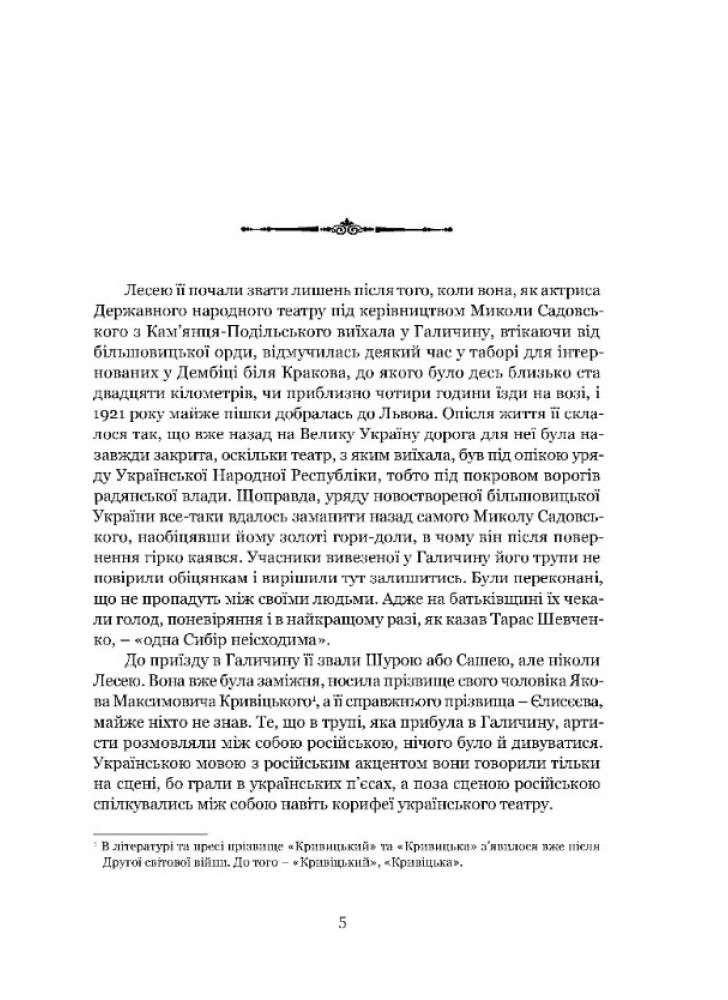 Ця розповідь не лише про життя однієї з найвизначніших українських актрис – Лесі Кривицької з історичного Чигирина, яка з театром Миколи Садовського емігрувала в Західну Україну, а й про гірку емігрантську долю актора взагалі й долю галицького актора з покоління Івана Рубчака, Йосипа Стадника, Володимира Блавацького, зокрема, а також про час, в якому їм довелося жити під різними окупаційними режимами й бути вірними своєму покликанню.