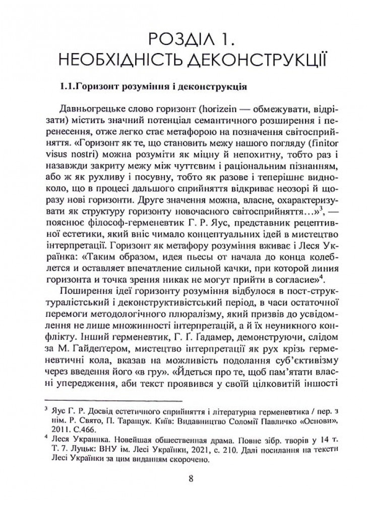 Обґрунтовується необхідність деконструкції як методології, яка дозволяє вписувати класичні твори у сучасний контекст, актуалізувати ті аспекти змісту і форми, які дослідники минулого не могли відчитати. Особлива увага приділена психоаналітичному прочитанню низки драматургічних текстів Лесі Українки, доведенню тези, що вона є авторкою нової символістської драми, вписаної у контекст європейського символізму і водночас унікальної за жанровими параметрами.