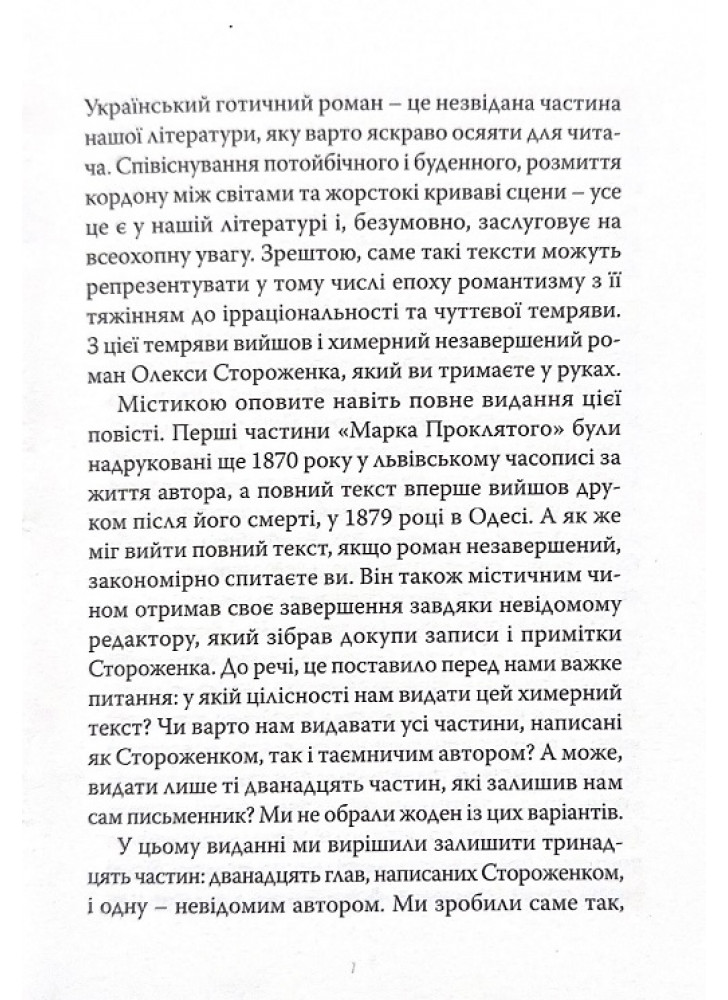 У літературному обрамленні Олекси Стороженка ця легенда набуває художніх і кровожерливих рис, стає по-справжньому готичною і збурює свідомість. Його Марко – це вигодуваний пташиною кров’ю ізгой, який за свої гріхи приречений вічно блукати землею. Цю моторошну повість доповнюють графічні ілюстрації сучасної української художниці Марії Химинець.