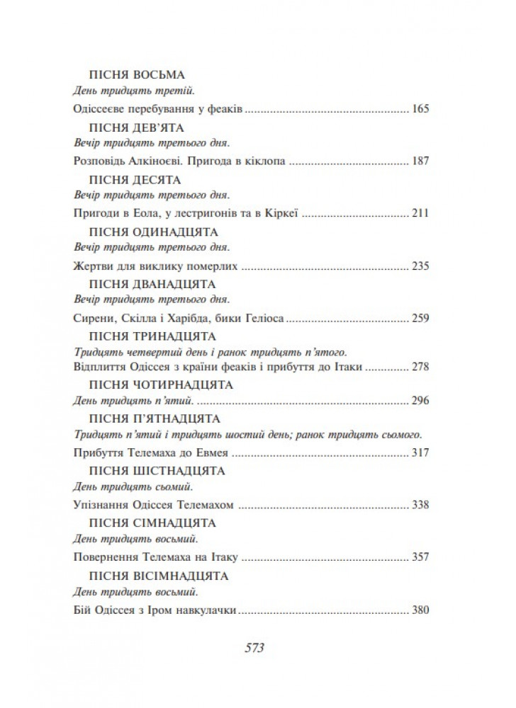 Поема змальовує цікаві побутово-звичаєві картини із життя стародавніх еллінів і разом з тим вводить читачів у казково-фантастичний світ грецької міфології. «Одіссея» дихає урочистим спокоєм і, сповнена духовної краси і величі, є завершеним втіленням класичної епопеї.