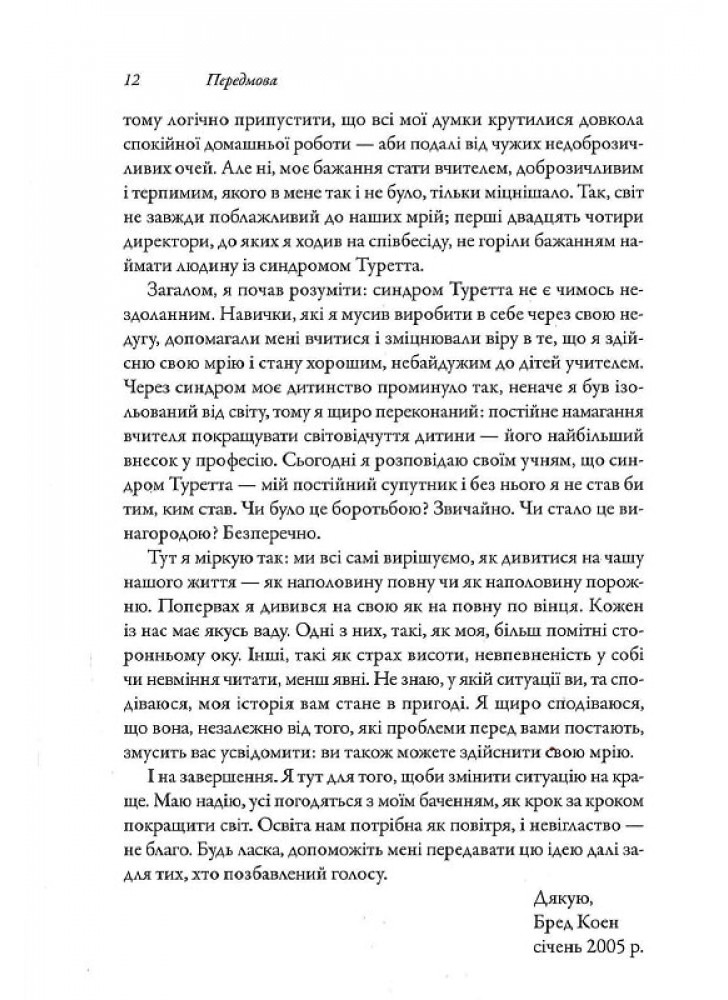 Навіть сьогодні Бреда іноді виганяють із кінотеатрів та ресторанів. Але історія Бреда Коена – це не про жалість до себе. Його непохитна рішучість і завзяте позитивне ставлення подолали труднощі, з якими він стикався в школі, коледжі та під час пошуку роботи. Бред ніколи не переставав іти до мети, і після двадцяти чотирьох співбесід він отримав роботу своєї мрії – став учителем в початковій школі.