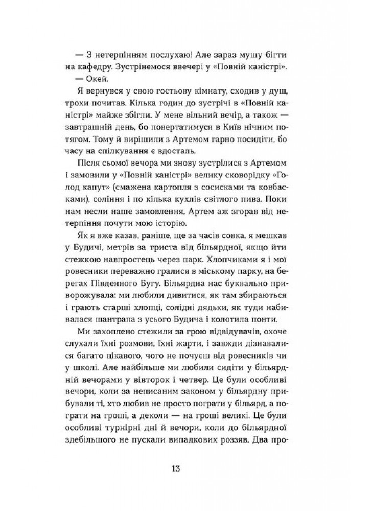 Новели й оповідання, які ввійшли до книжки «Перший кий Будича», продовжують розповідати історії Будича, їх часопростір триває із середини 1980-х до наших днів. Тут є бандитська більярдна та її відвідувачі кінця 1980-х, провінційні журналісти і школярі, дивакувата інтелігенція, пенсіонери-відлюдники… Саме цими часовими, світоглядними зіткненнями автор маркує важливі моменти трансформації українського соціуму, дає можливість нам разом з ним зазирнути в ту чи іншу епоху.