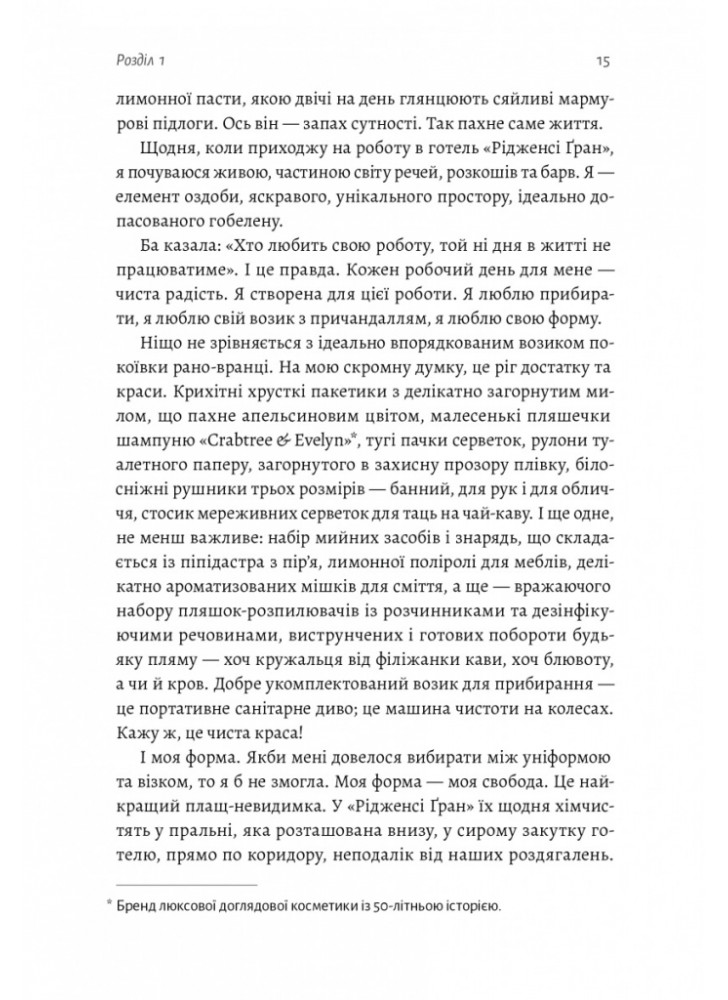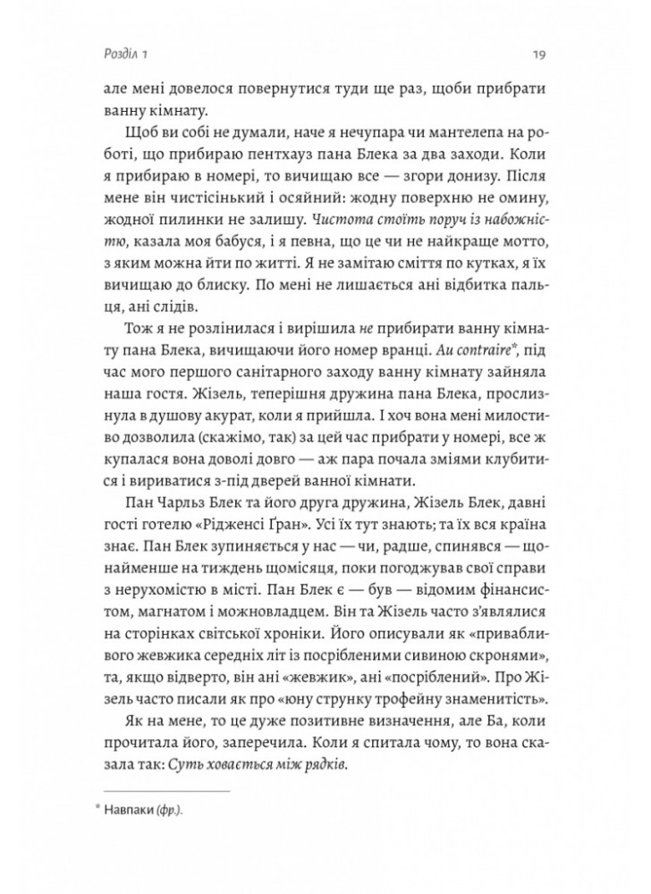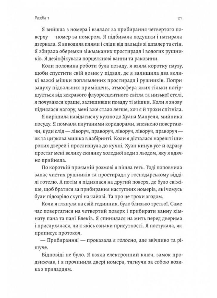 Життя Моллі перевертається у той день, коли в одному з номерів вона знаходить труп постійного клієнта — багатія Чарльза Блека. Героїня стає першою і головною підозрюваною. Розгадати цю головоломку і підібрати ключі до таємниці доводиться самій Моллі. «Покоївка» — це роман, який крім захопливого детективного сюжету, пропонує поглянути глибше на життя людей, які не вписуються у соціальні стандарти. Чи вдасться усім нарешті побачити цю дивну невидиму покоївку? Чи зможе Моллі віднайти правду і довести свою невинність?