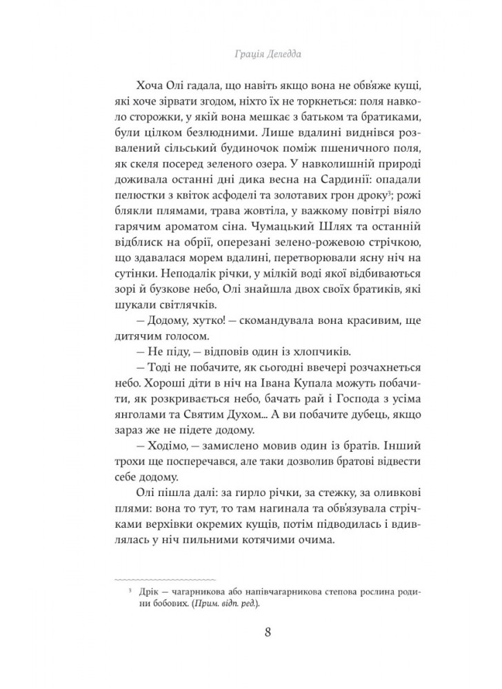 Грація Деледда – італійська письменниця, лауреатка Нобелівської премії з літератури 1926 року «за поетичні твори, у яких із пластичною ясністю описується життя її рідного острова, а також за глибину підходу до людських проблем загалом». Роман «Попіл» 1904 р. – один із найбільш неоднозначних і цікавих творів Грації Деледди.