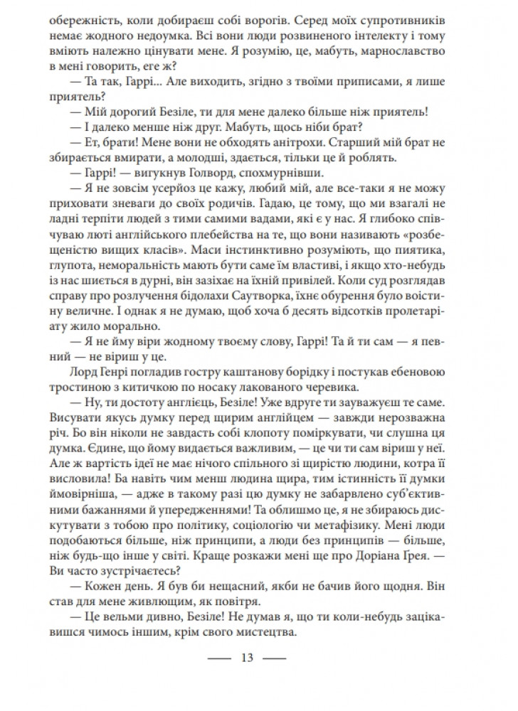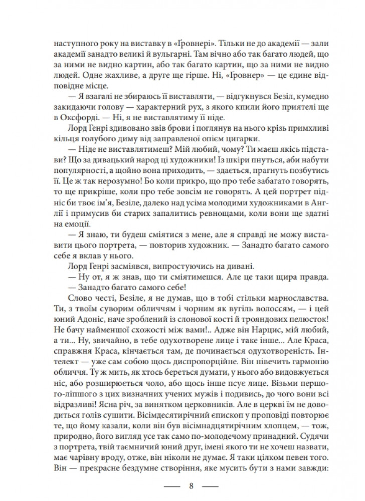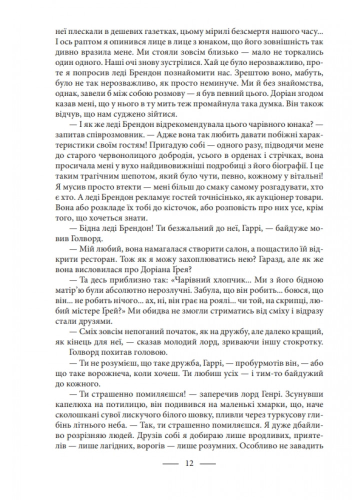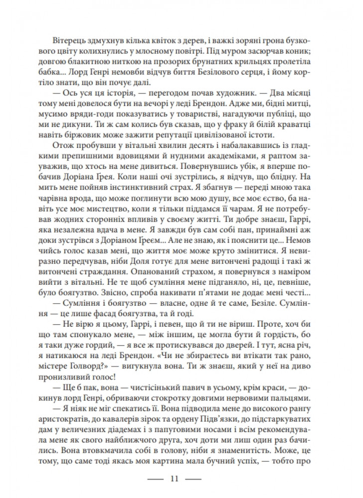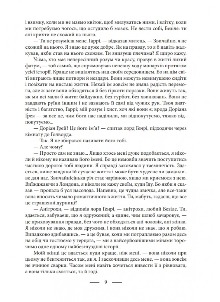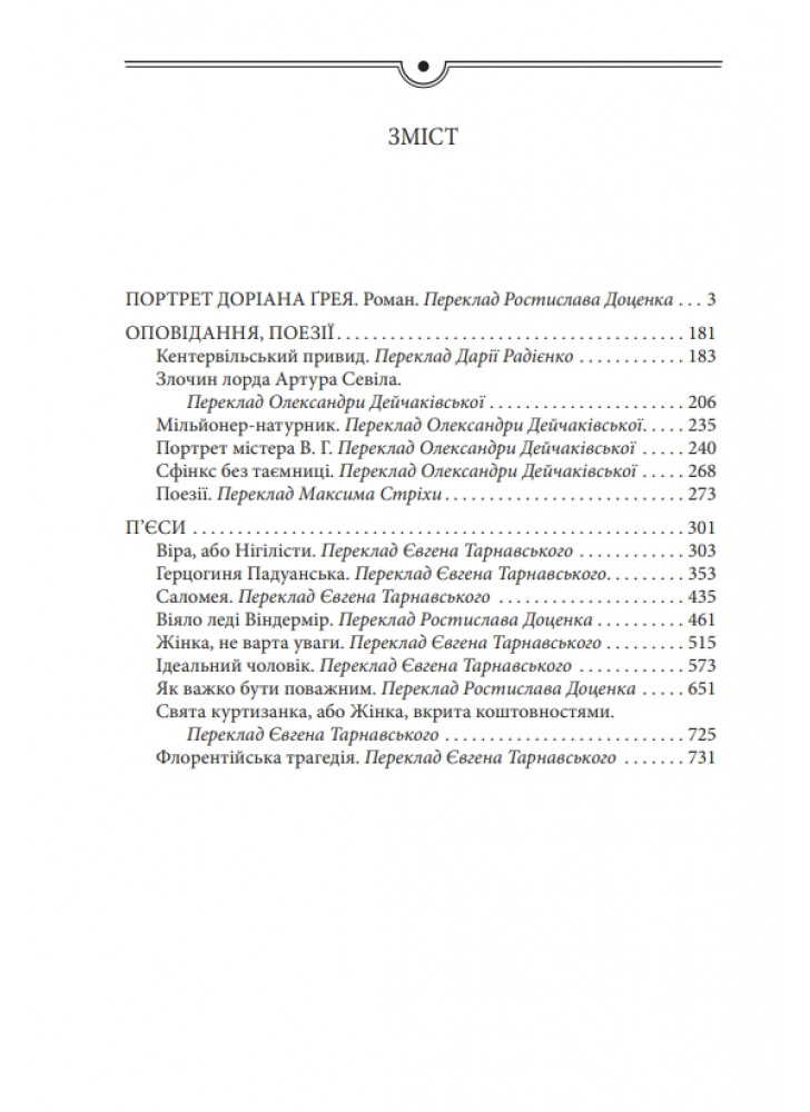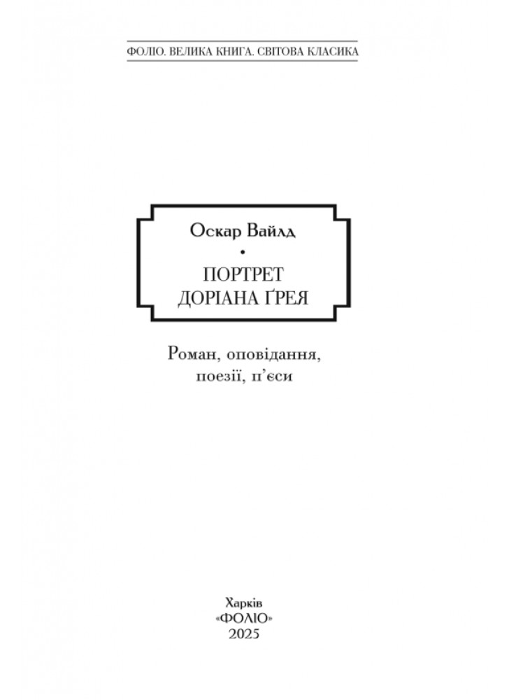 Єдиний роман Вайлда — «Портрет Доріана Ґрея», написаний за рекордно короткий термін — лише за три тижні, викликав гучний резонанс, зробив автора надзвичайно відомим, водночас збуривши тогочасне суспільство. Доріан, неймовірно вродливий юнак, одного разу, милуючись власним портретом, побажав, щоб його зображення старішало замість нього. Це бажання здійснилось: обличчя Доріана зберігало юність, хоча сам він занурювався у порок і розпусту, а портрет натомість змінювався, відображаючи його справжню суть. Та розплата не забарилась... До видання також увійшли оповідання, поезії та п’єси Оскара Вайлда.