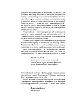Смерть. Заперечення. Гнів. Депресія. Прийняття. Жодна історія не може повернути близьких, але інколи чужа історія може допомогти зрозуміти та пережити втрату. У нашій країні триває війна, щодня гинуть люди – захисники та захисниці, кохані, батьки, діти, брати й сестри. І все, що ми можемо, – лише навчитися жити із цією втратою. Своєю історією в цій книжці ділиться історикиня Олеся Хромейчук.