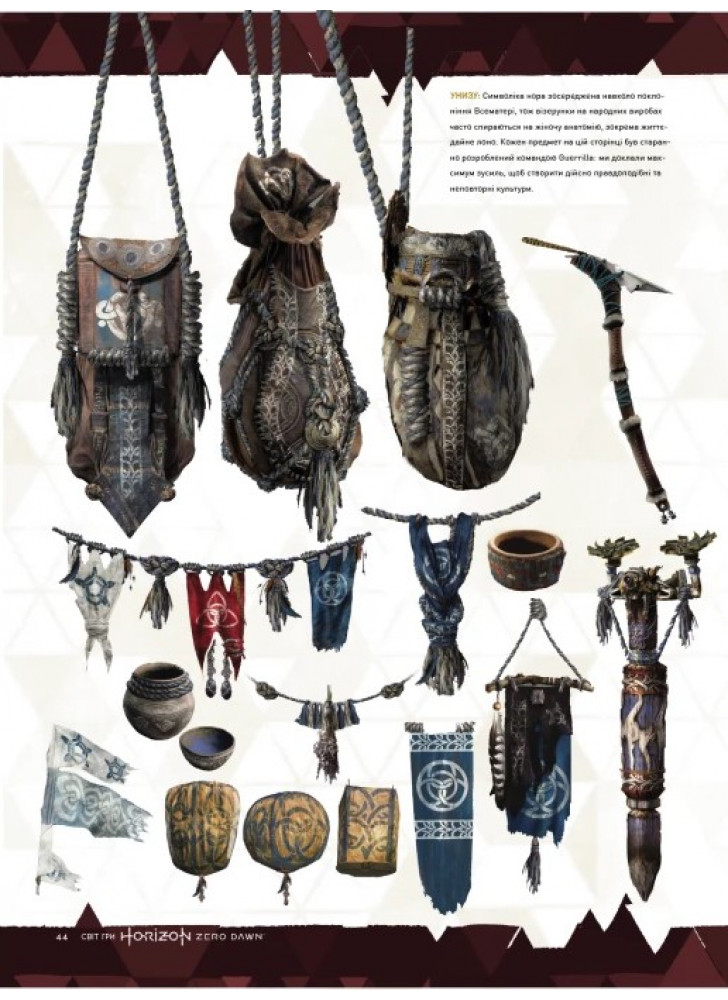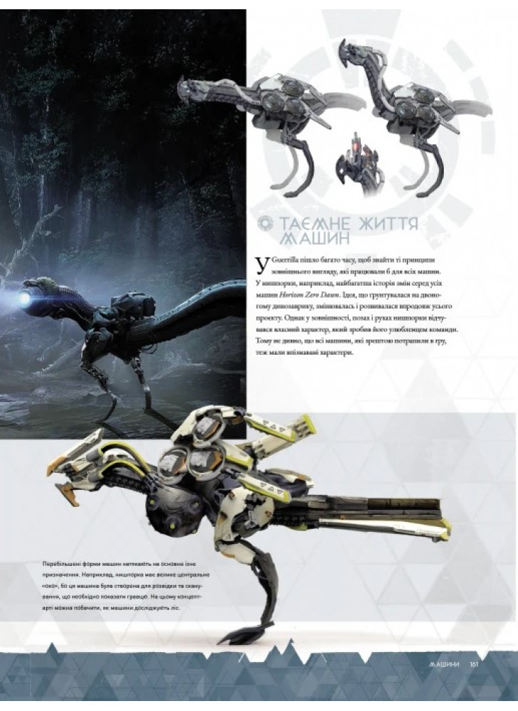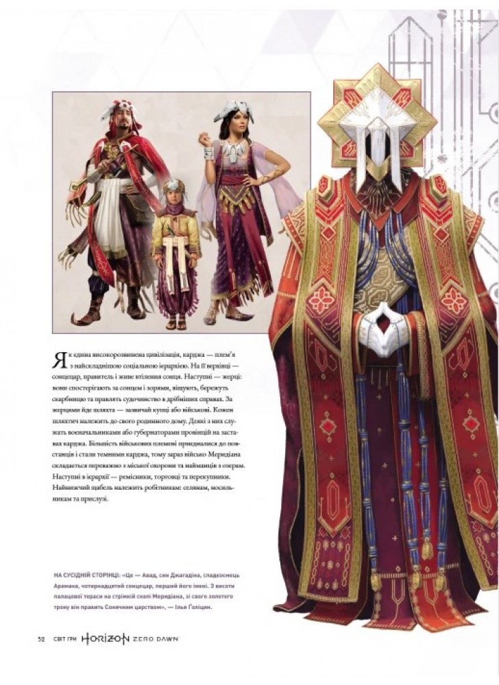 «Світ гри Horizon Zero Dawn» занурює вас у обширний і насичений світ нової гри від Guerrilla Games. До артбука ввійшли детальні нариси й розкішні художні роботи, а також розповіді художників і розробників. Від величних міст та буйних рівнин — до розмаїтих культур племен та дивовижних машин, що бродять по землі: такий яскравий візуальний путівник проведе вас стежинами створення цього світу, прекрасного й небезпечного.