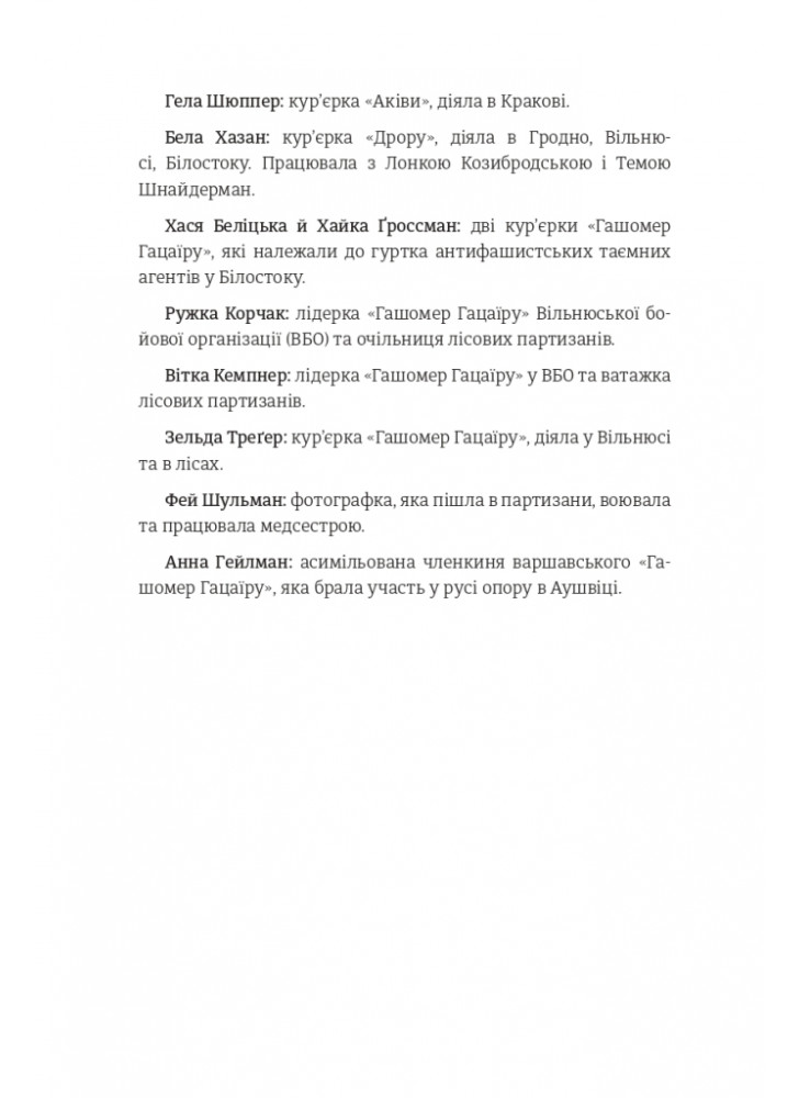 Їм довелося зробити вибір: захист чи порятунок, боротьба чи втеча. Завдяки своїй статі та можливості приховати власну єврейськість, жінкам вдалося унікально пристосуватися до деяких важливих і небезпечних для життя завдань, зокрема виконувати роль кур’єрок. А ще вони підкуповували охоронців гестапо, переховували револьвери в буханках хліба й допомагали розбудувати системи підземних бункерів. Допомагали хворим і навчали дітей, бомбили німецькі залізничні шляхи та підривали електропостачання у Вільнюсі.
