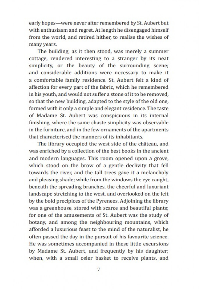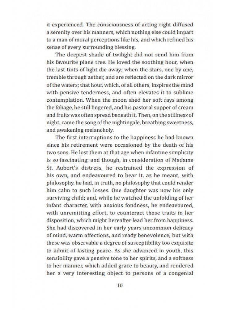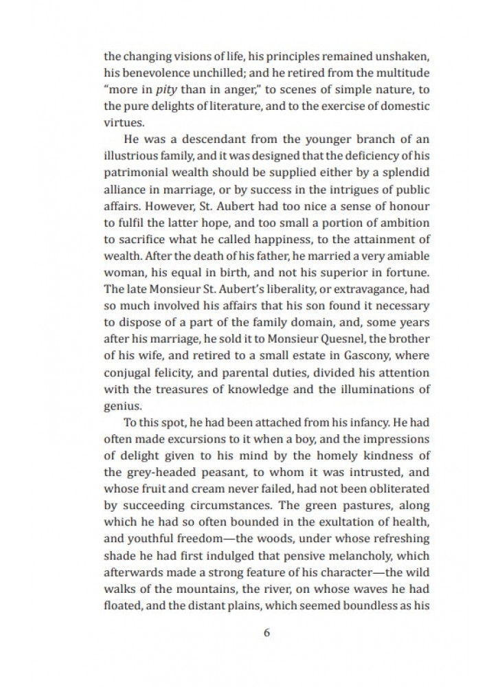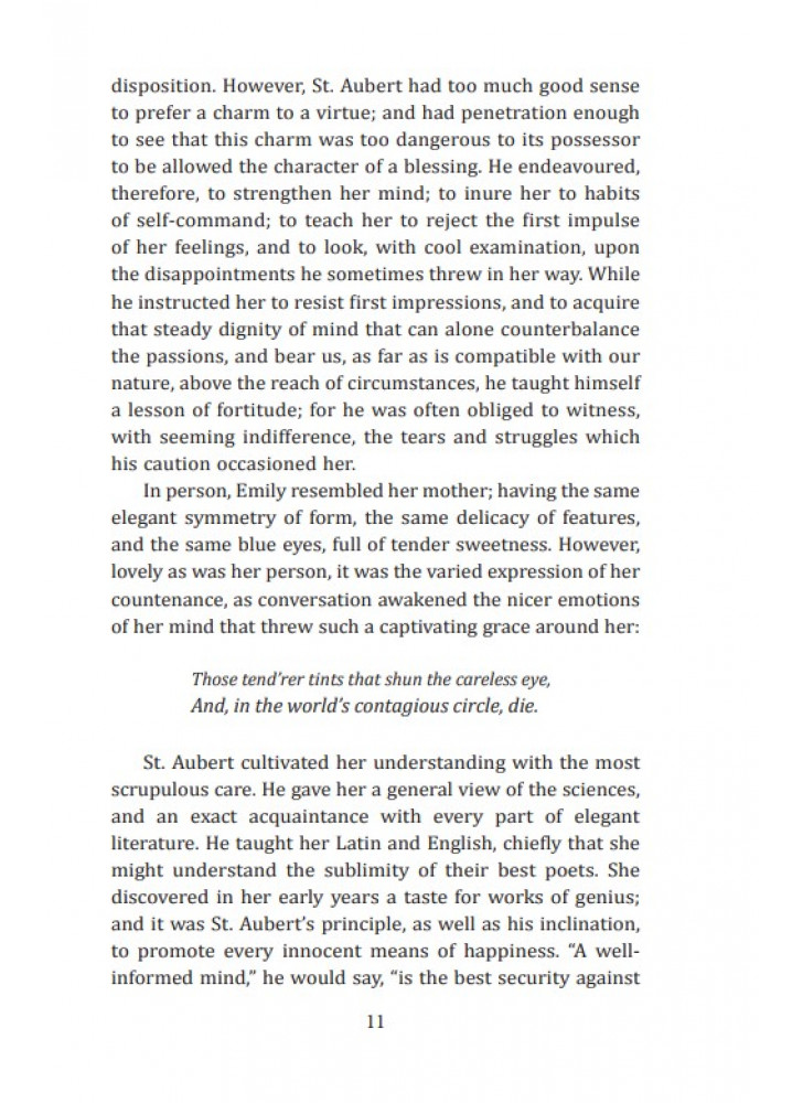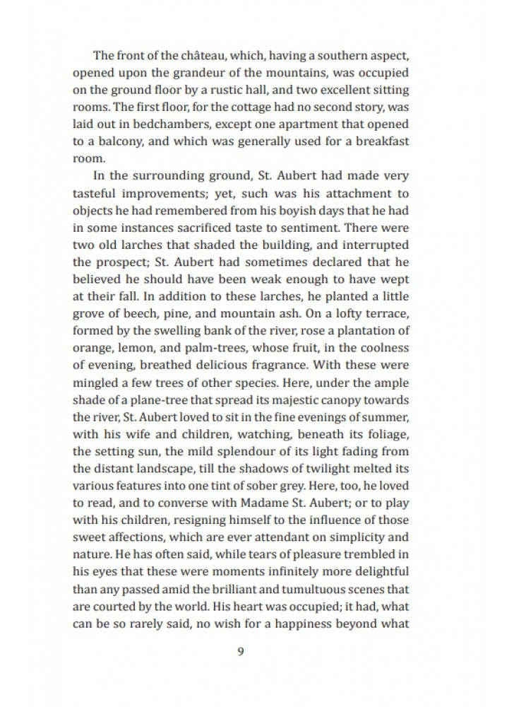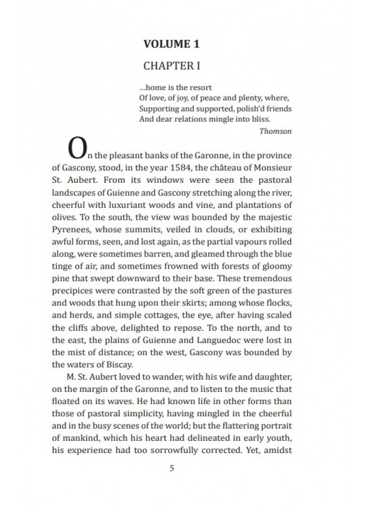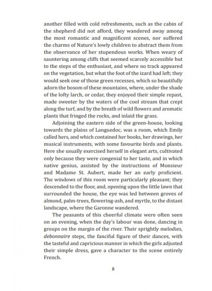 The Gothic novel The Mysteries of Udolpho by the English writer Anne Radcliffe (1764–1823) is set in the 16th century in Southern France and Northern Italy. In the first part of the novel, the reader learns about Emily St. Aubert, a young Frenchwoman, the only child in a once wealthy family. After the death of her mother, she accompanies her father on a journey. She meets Valancourt, a handsome man, and falls in love. Emily’s father dies, and Emily, now an orphan, is forced to live with her aunt, Madame Cheron.