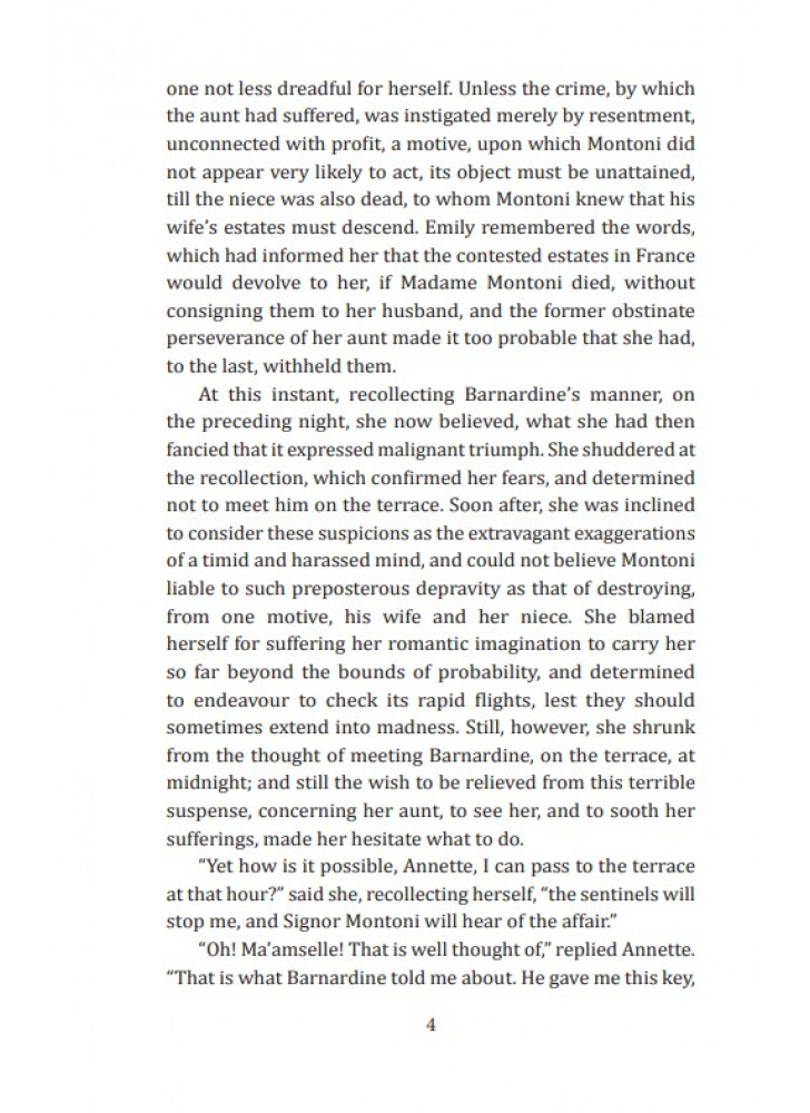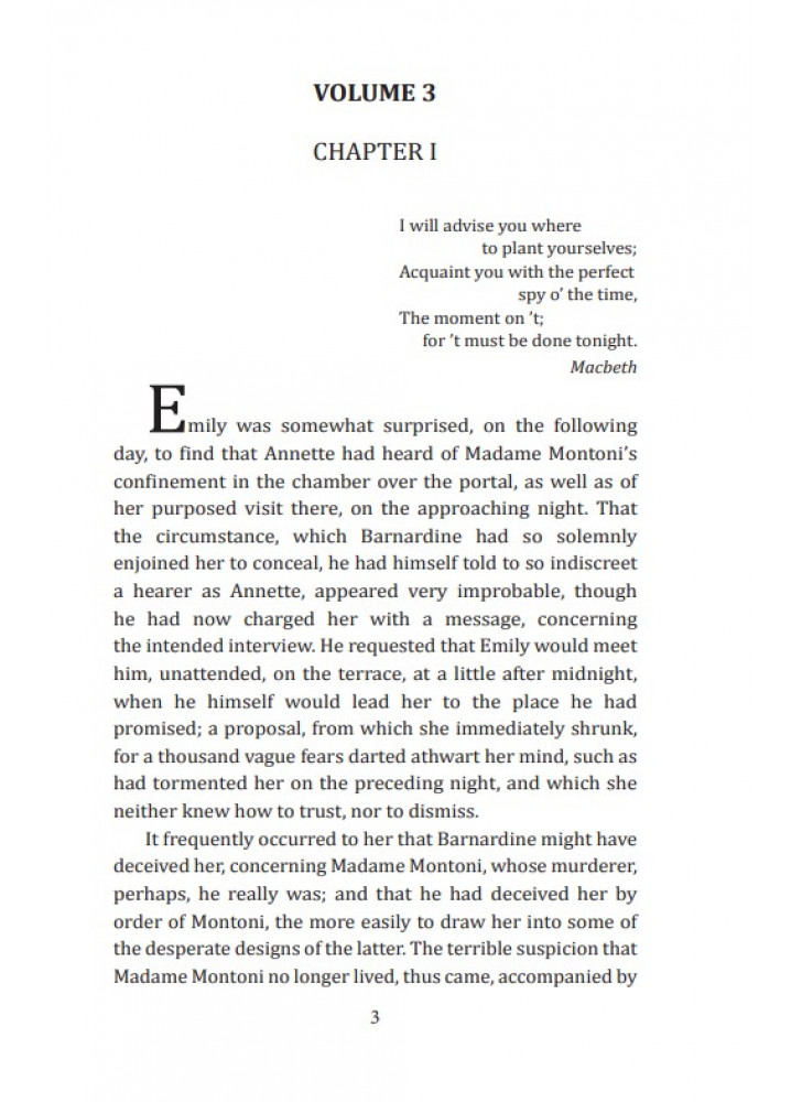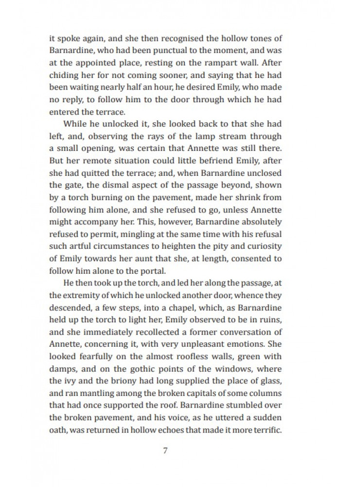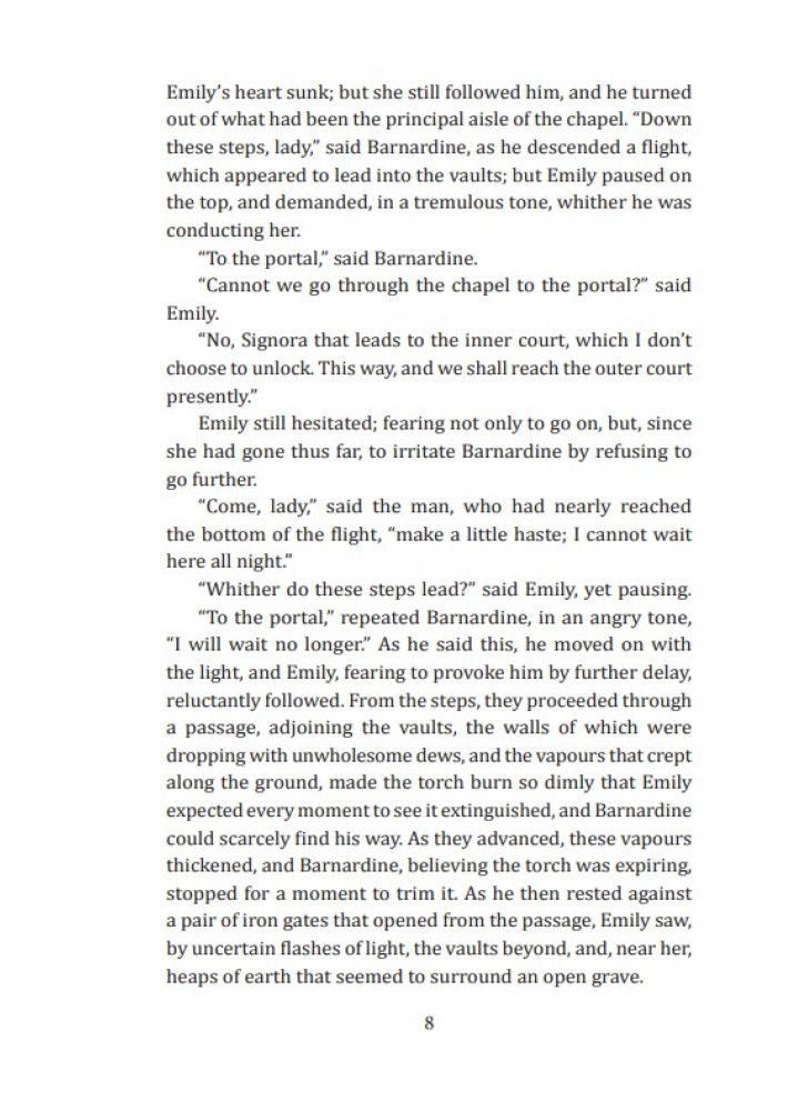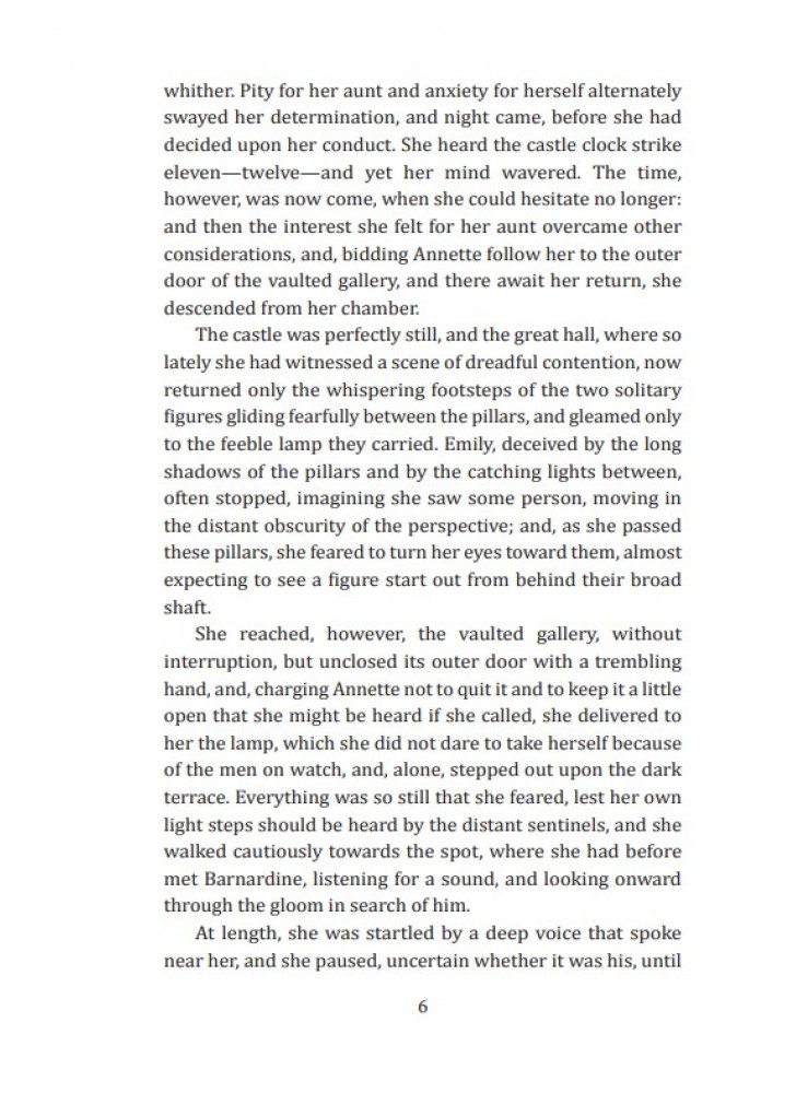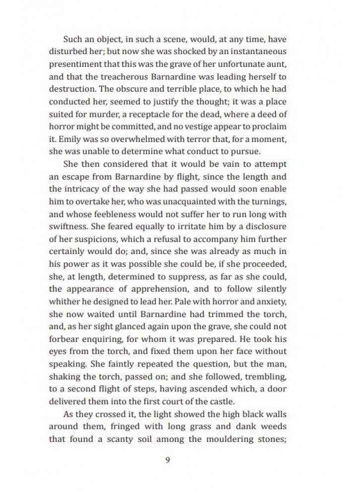 The Gothic novel The Mysteries of Udolpho by the English writer Anne Radcliffe (1764–1823) is set in the 16th century in Southern France and Northern Italy. In the second part of the novel, Emily, now an orphan, is forced to live with her aunt, Madame Cheron. The aunt marries Montoni, a nobleman from Italy. He wants his friend Count Morano to become Emily’s husband. Finding Morano almost broke, Montoni takes Emily and her aunt to his castle, Udolfo. Montoni is trying to force his wife to transfer the property to him. Madame Cheron dies. Emily manages to escape...