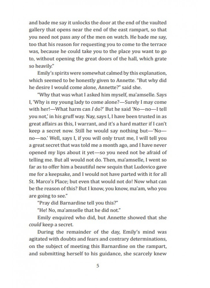 Дія готичного роману «Таємниці Удольфо» англійської письменниці Енн Редкліфф (1764—1823) відбувається в XVI столітті в Південній Франції та Північній Італії. У другій частині роману Емілі, яка тепер залишилася сиротою, змушена жити зі своєю тіткою, мадам Шерон. Тітка виходить заміж за Монтоні, дворянина з Італії. Він хоче, щоб його друг граф Морано став чоловіком Емілі. Виявивши, що Морано майже розорений, Монтоні відвозить Емілі та її тітку до свого замку Удольфо. Монтоні намагається змусити дружину переписати на нього майно. Мадам Шерон помирає. Емілі вдається втекти...