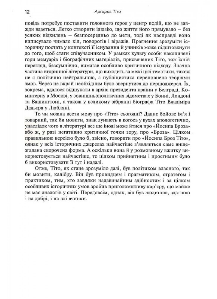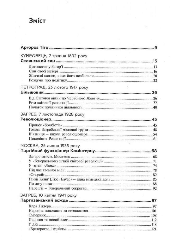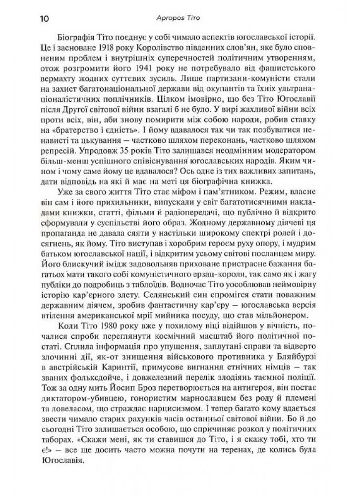 Йосип Броз Тіто був вічним партизаном – типовим створінням епохи крайнощів, епохи, яку він не тільки пережив, а й власноруч сформував і вистраждав. За своє життя він був визнаним у всьому світі державним діячем. На сьогодні ж багато хто вважає його жорстоки диктатором. То ким же він був насправді? Марі-Яніна Каліч надає чудову нагоду за міфами та легендами краще роздивитися цю історичну постать, оповідаючи авантюрну історію його життя на тлі злетів і падіння, яких зазнала Югославія.