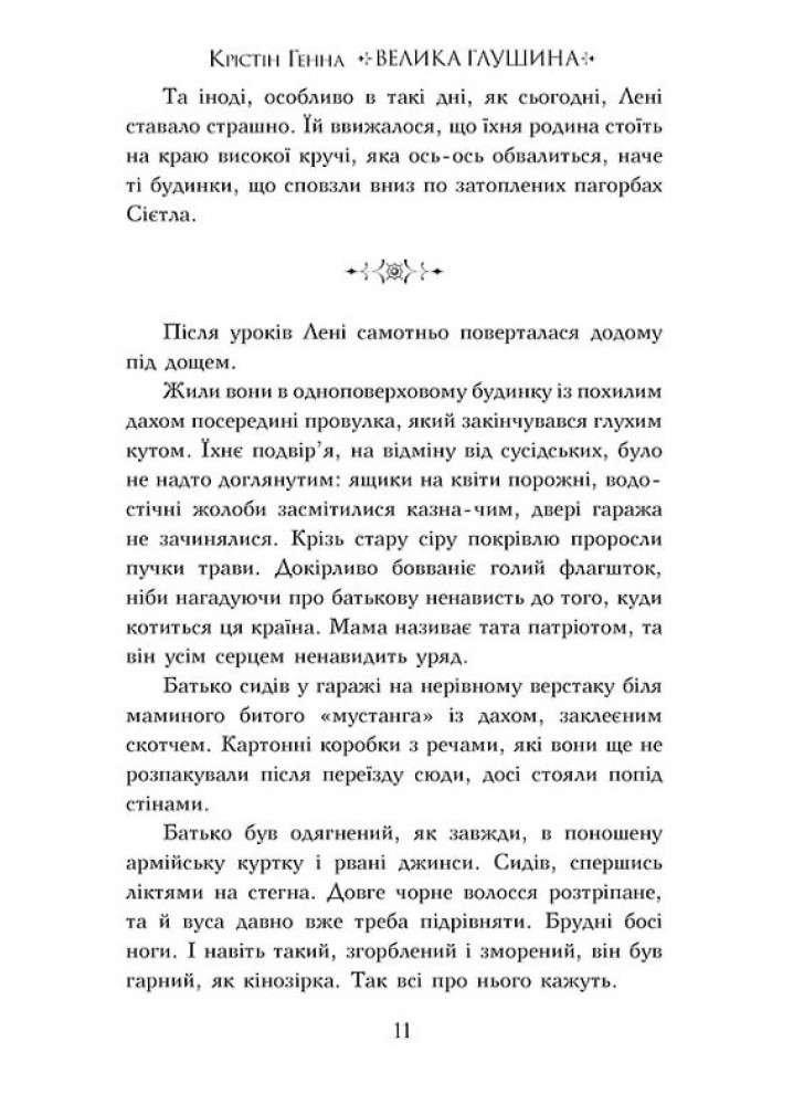 Крістін Генна влучно описує слабкість і стійкість людини, майстерно змальовує незламний дух американських першопрохідців і атмосферу вже напівзниклої Аляски — незрівнянно прекрасної і невблаганно небезпечної землі. «Велика Глушина» — відверта й красива історія про боротьбу за виживання, любов, утрату і те глибинне, що живе в серці кожної людини.