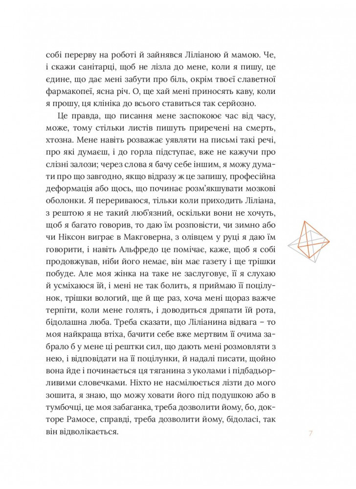 Ці оповідання виступають сторонами цілісної фігури, спільно становлячи її зміст: так герой, який оповідає про свою власну смерть в оповіданні «Ліліана плаче», має свій протилежний бік в оповіданні «Фази Северо». Кожний із сюжетів знаходить у цій книжці альтернативні продовження, дивні форми відлуння. Світ історій «Восьмигранника» стислий і водночас безмежний; точний, але й непередбачуваний. Якщо збірку оповідань можна схарактеризувати як прихований роман, то це, без сумніву, про «Восьмигранник».