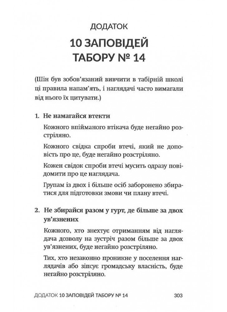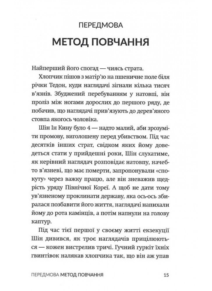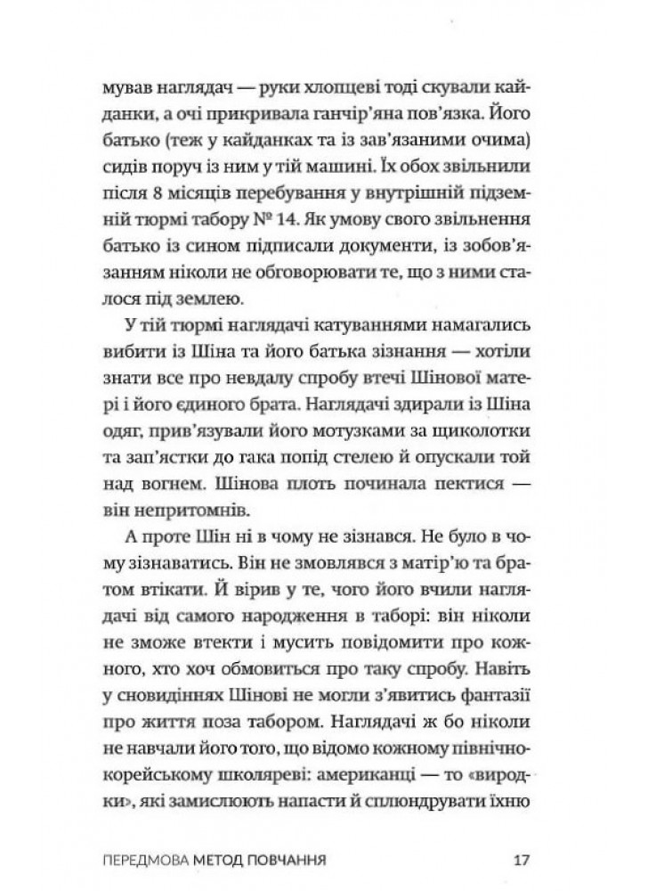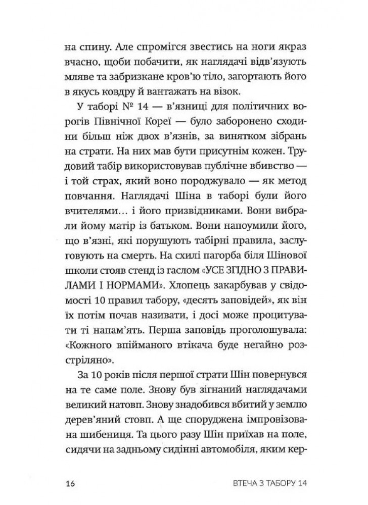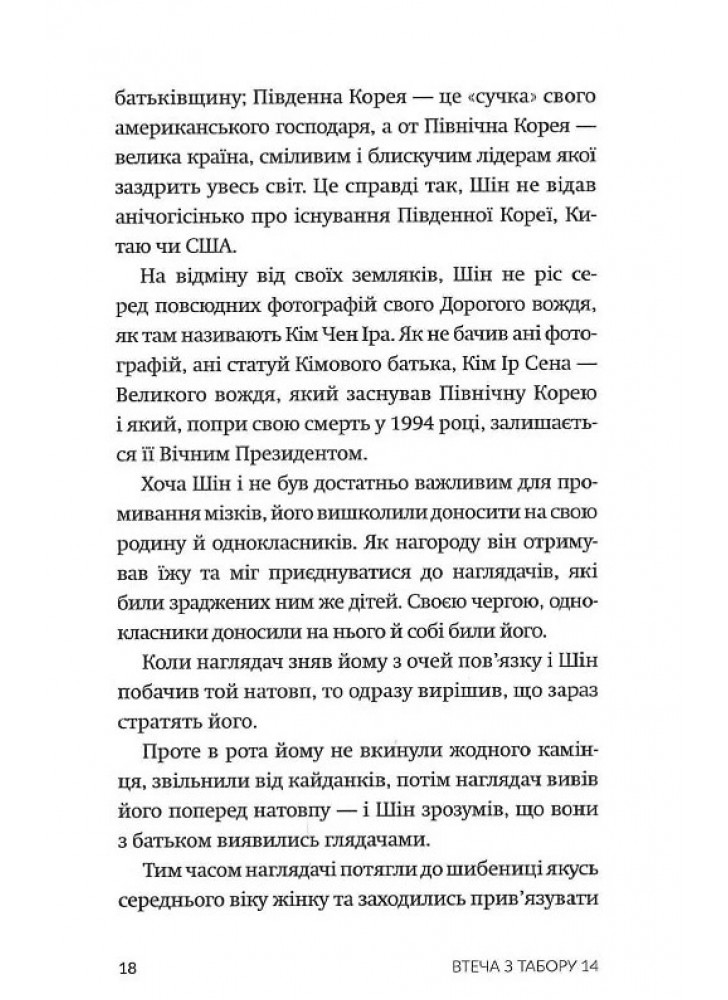 Табірні охоронці виховували з нього стукача, він сприймав рідну матір як суперницю в боротьбі за їжу, він став свідком страти своєї родини — і вважав усе це нормою… аж поки не втік. Спершу з табору, а тоді — з Північної Кореї. У «Втечі з Табору 14» відомий американський журналіст Блейн Гарден переповідає історію Шінового життя. Це моторошна й водночас захоплива розповідь про мужність, витривалість та виживання, й основне — про неймовірну втечу з найбільш репресивної тоталітарної держави у світі.
