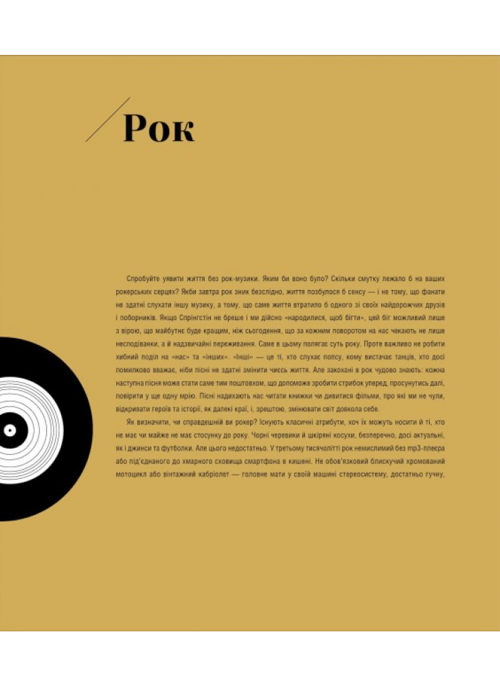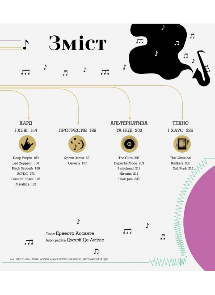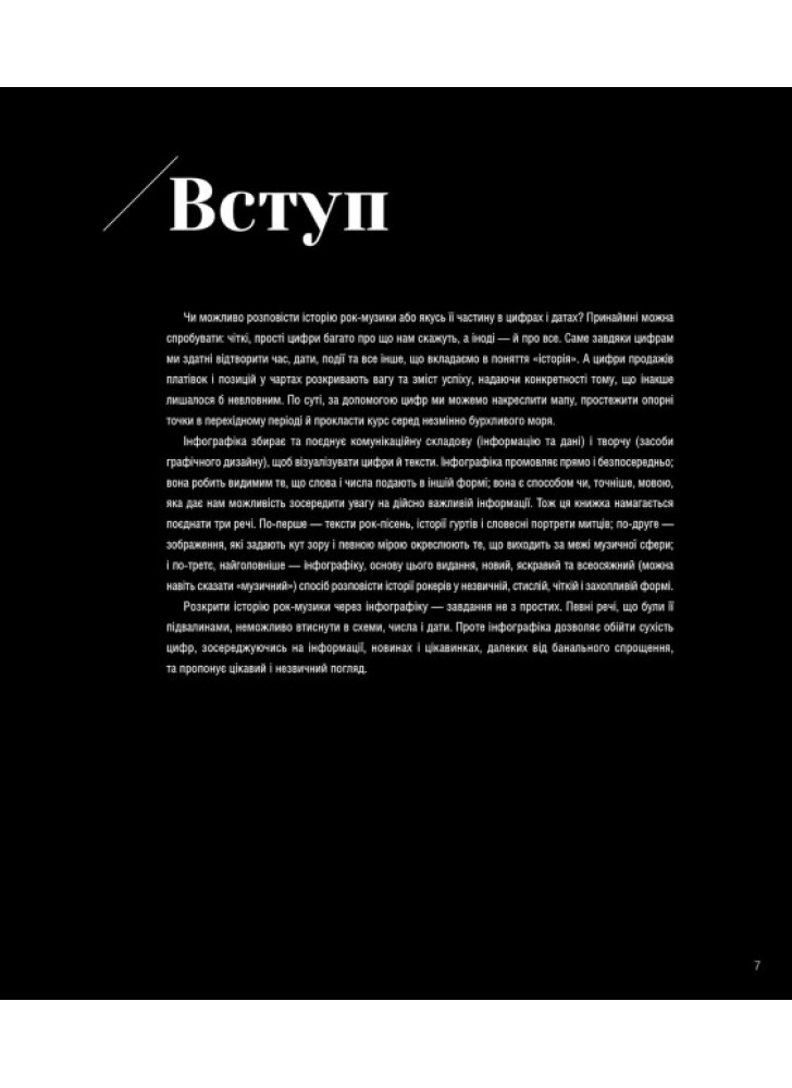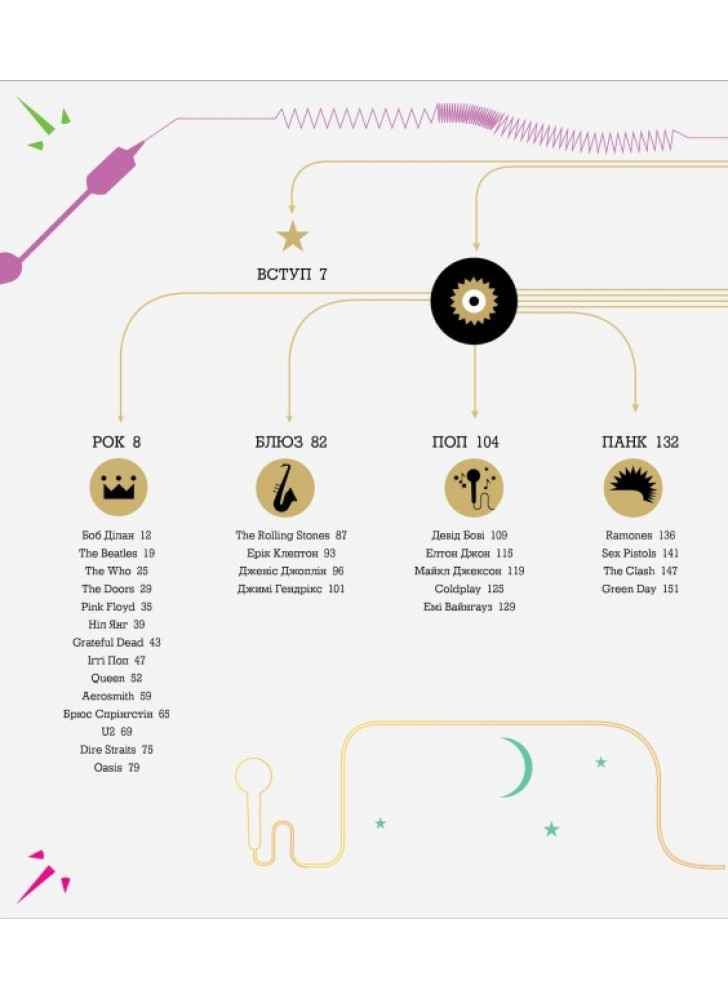 Боб Ділан, «The Beatles», Девід Бові, «Queen», «Ramones », «Nirvana», «The Chemical Brothers» — зірковий шлях кожного гурту чи виконавця масштабно візуалізовано у поєднанні хронології і фактів: кількість проданих платівок і світових турів, місця у чартах, премії, гонорари, авдиторія у соцмережах тощо.