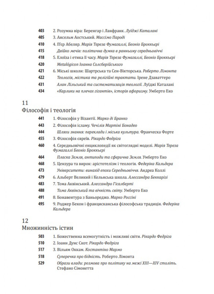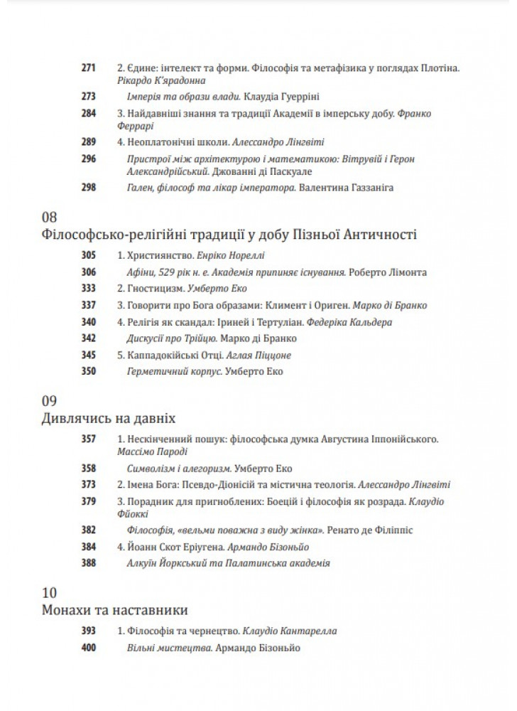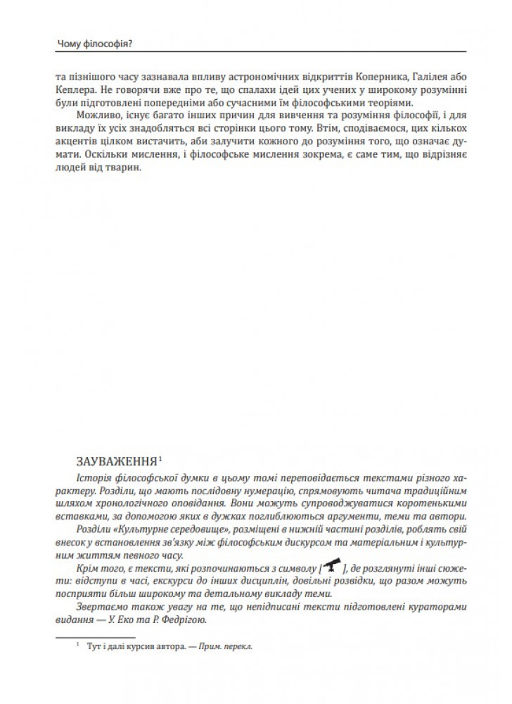 Енциклопедичне видання «Історія філософії» за редакцією Умберто Еко та Рікардо Федріги розповідає про розвиток філософської думки від Античності до Новітнього часу і складається з трьох томів. 1-й том — «Історія філософії. Античність та Середньовіччя». Коли у первісної людини з’явилась можливість думати не тільки про виживання, вона замислилася про те, для чого вона прийшла в цей світ і хто створив усе, що її оточує, — саме тоді, можна стверджувати, і народилася філософія як така. За первинною етимологією термін «філософія» означає «любов до знання».