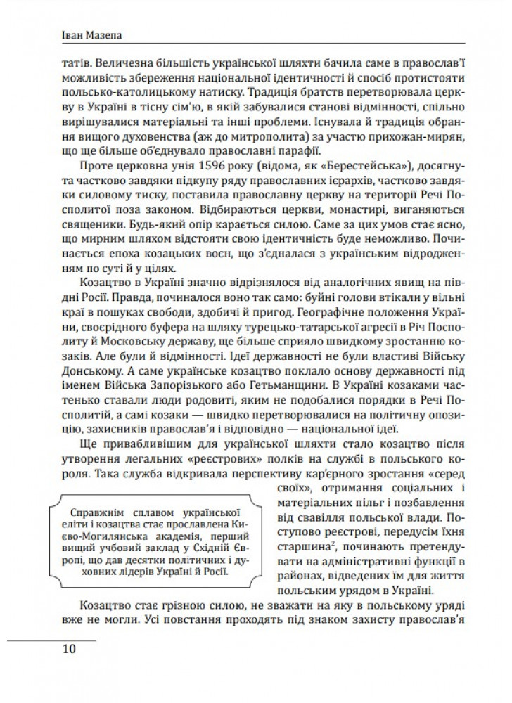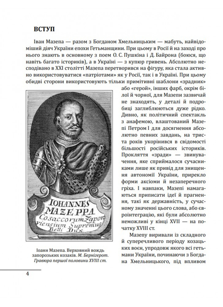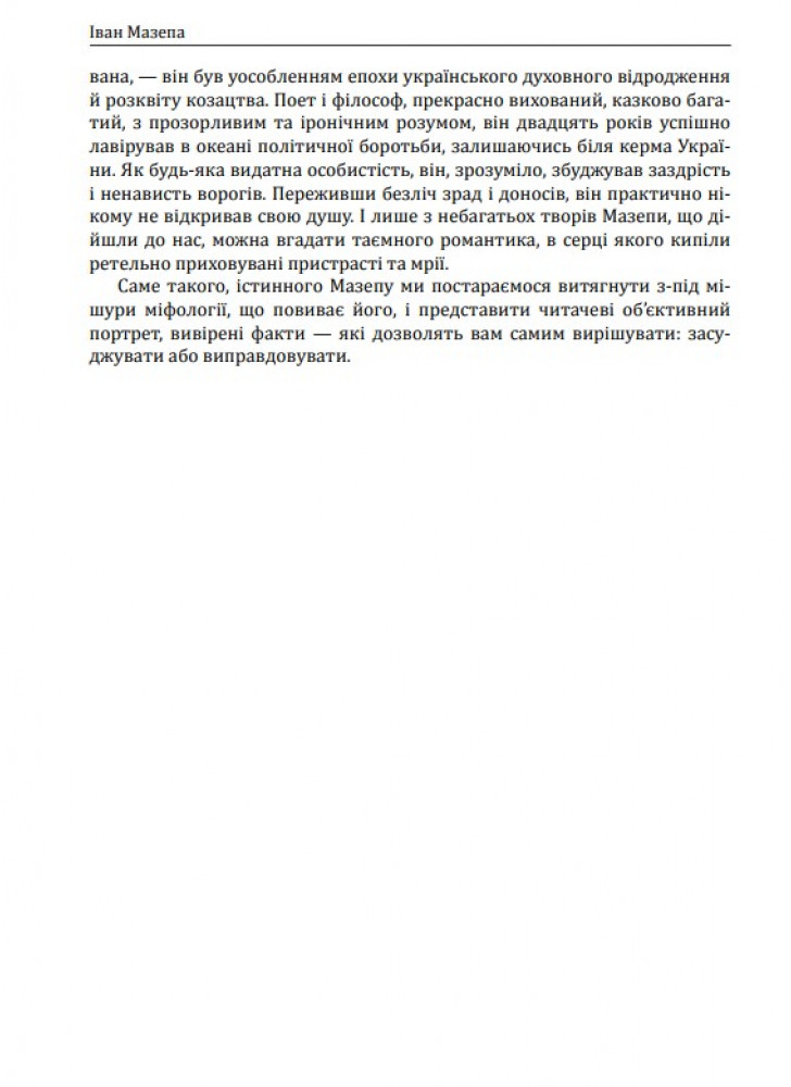Не зрадник імперії і царя, а неординарна особистість, різнобічно обдарована, неабиякого розуму, сили духу та патріотичної самосвідомості. Ця книга - український переклад тієї самої, гучної, доопрацьований автором. Т. Таїрова-Яковлєва звертається до читача зі вступним словом, дещо за ці роки змінилося у самому «мазепознавстві» – деякі факти і констатації автором відкориговані й доповнені. Все це надає книзі ще більшої наукової цінності й глибини, відкриваючи нам все нового Мазепу...