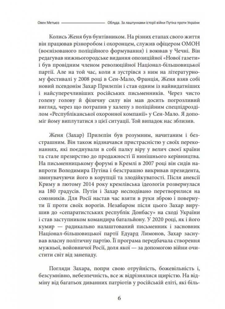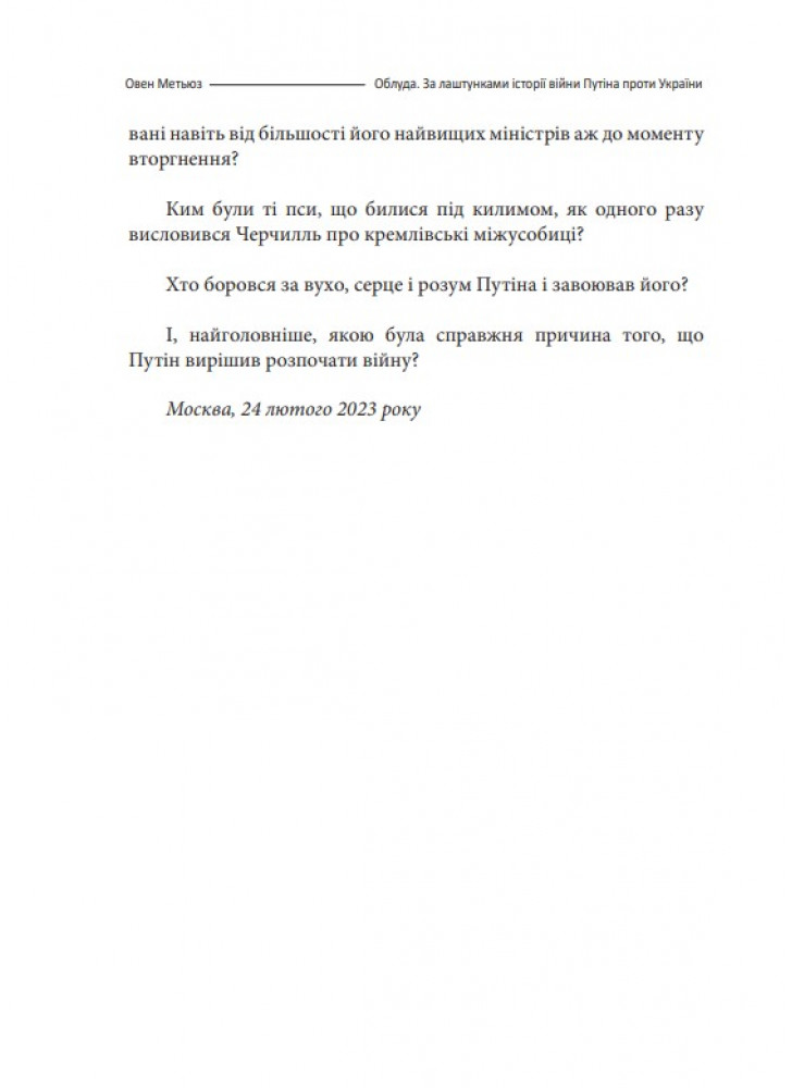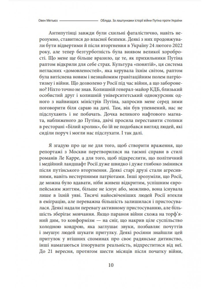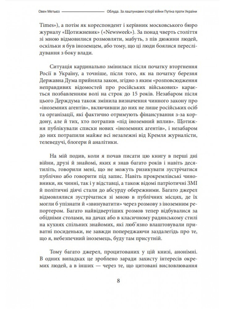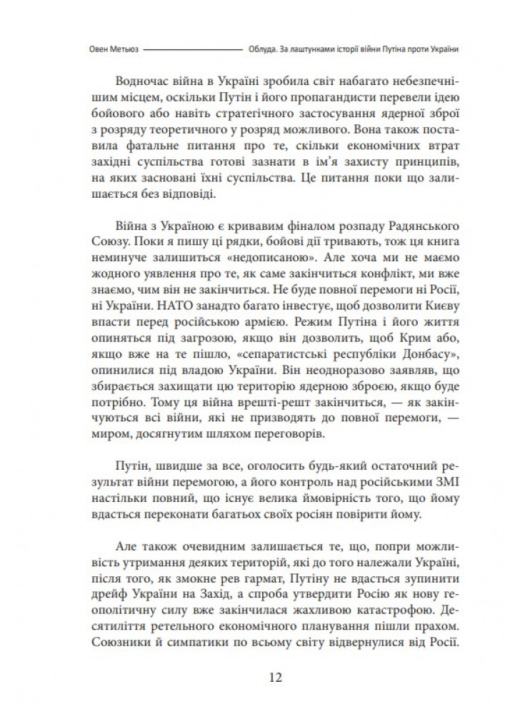 Нова книга британського письменника, історика і журналіста Овена Метьюза (нар. 1971 р.) «Облуда. За лаштунками історії війни п*тіна проти України» — це розповідь про причини вторгнення в Україну 2022 року та перший рік повномасштабної війни на основі репортажів автора з Р*сії та України.