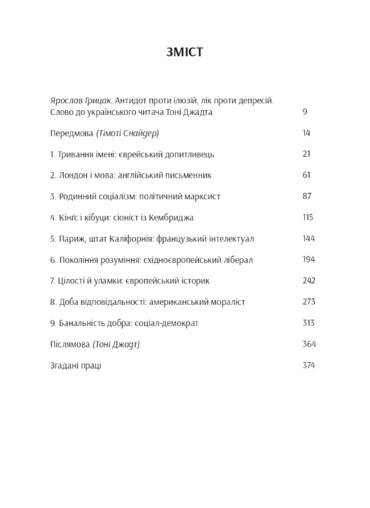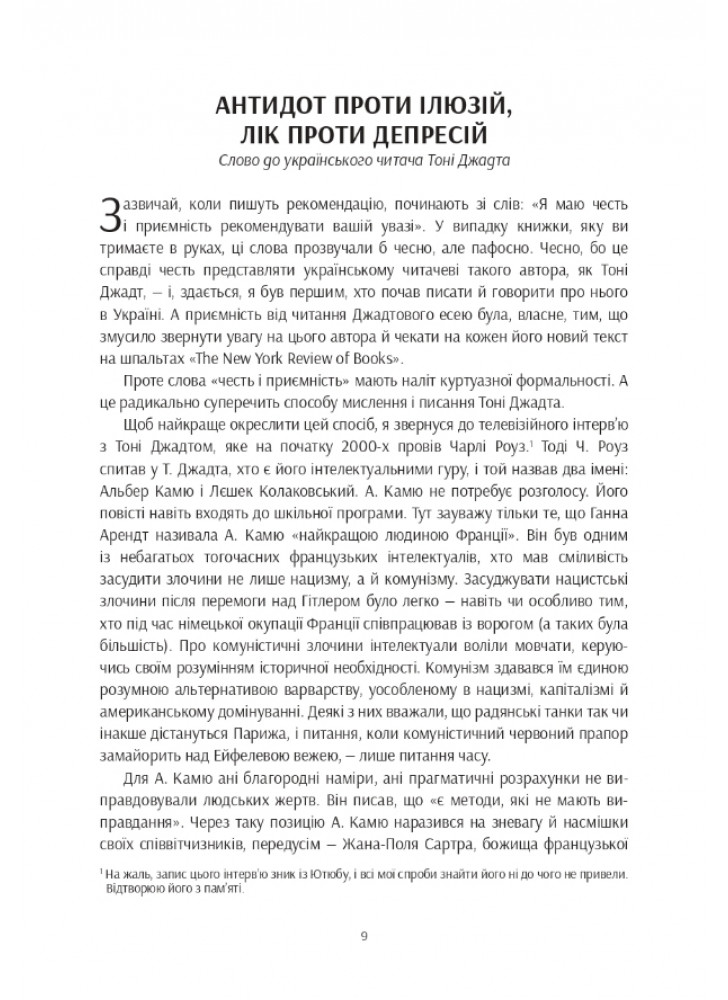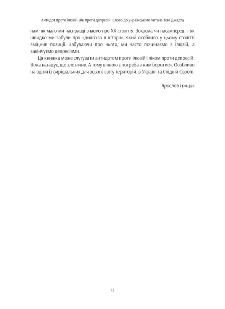 Ця книжка, написана у формі діалогу, дає читачеві нагоду побачити справжнє ХХ століття. Джадт у розмові зі Снайдером доступно й глибоко аналізує головні виклики ХХІ століття, пов’язані з невивченими уроками століття минулого; пояснює, чому неосмислене й непокаране зло повертається і як йому протидіяти.