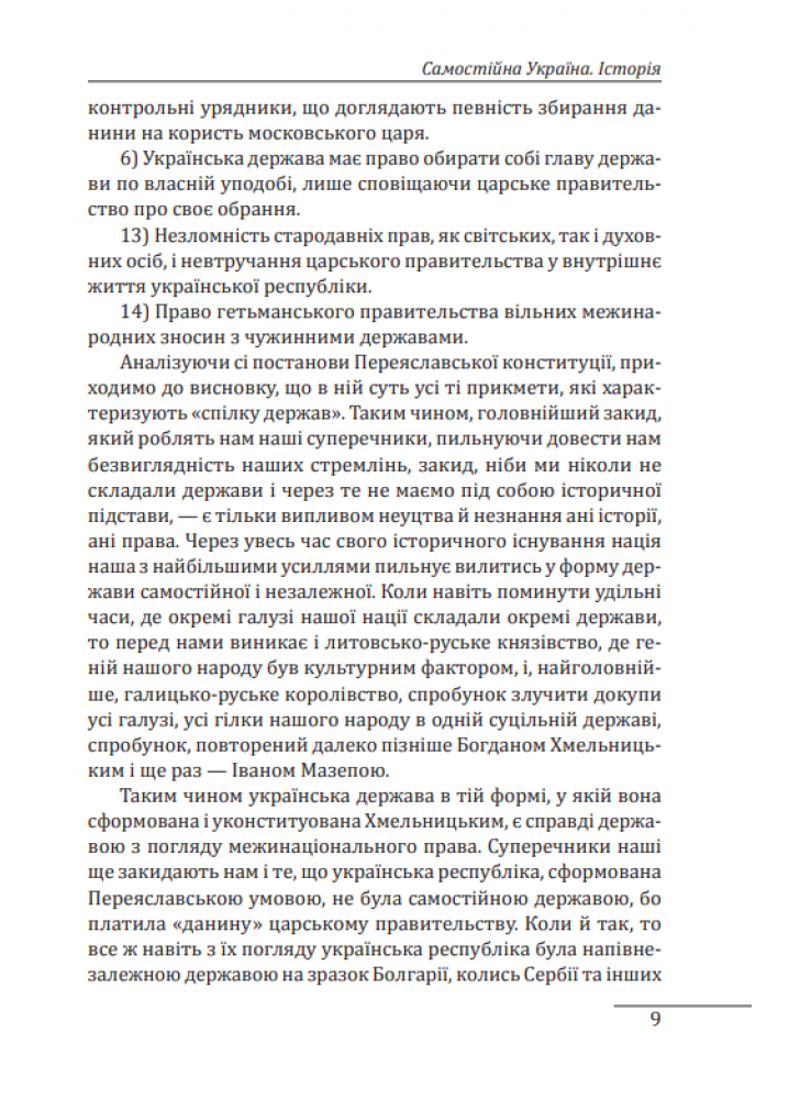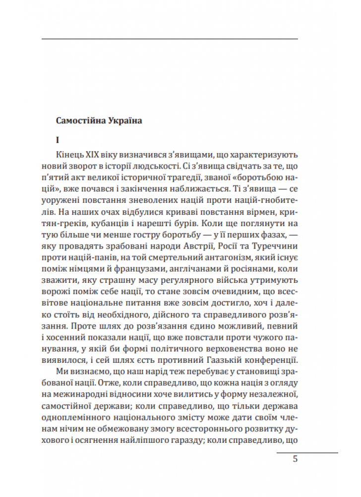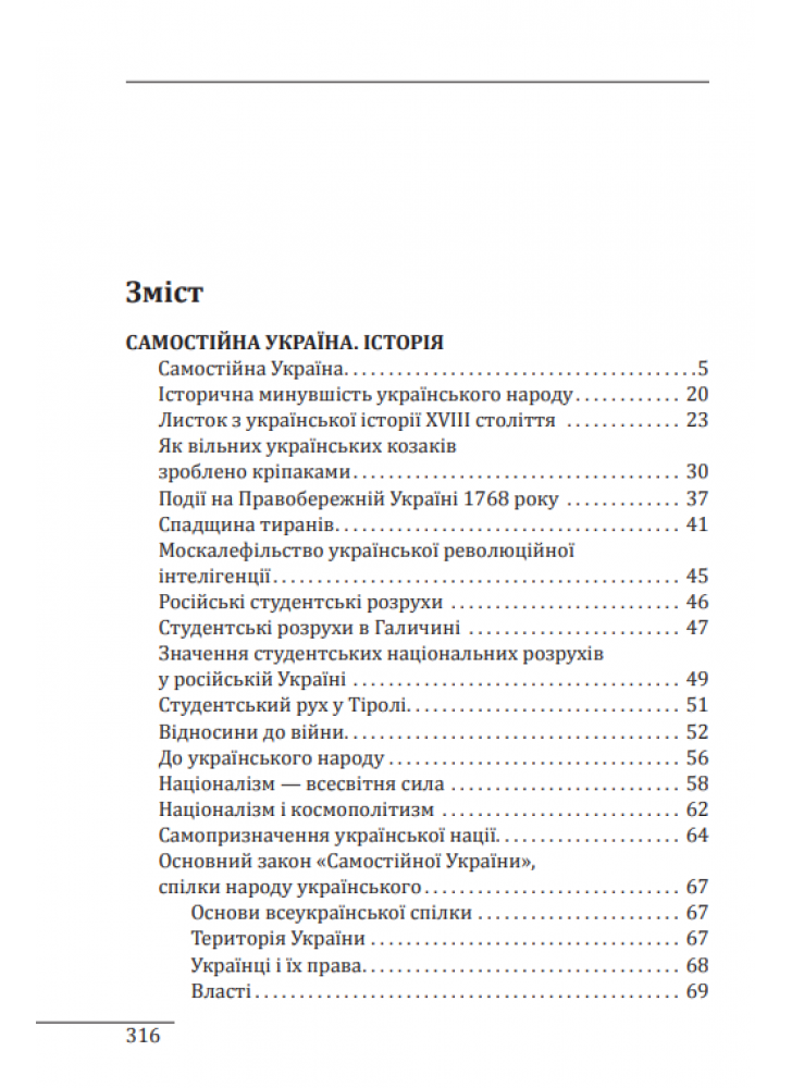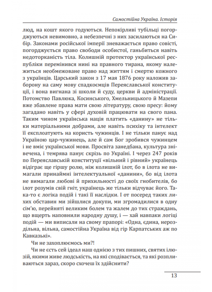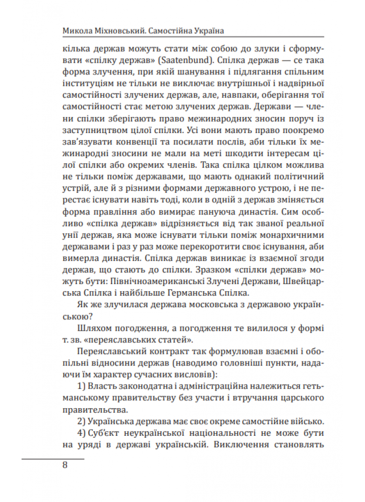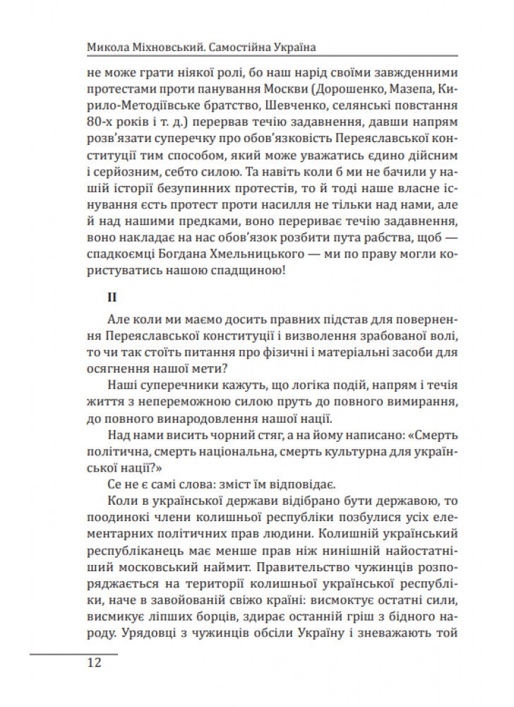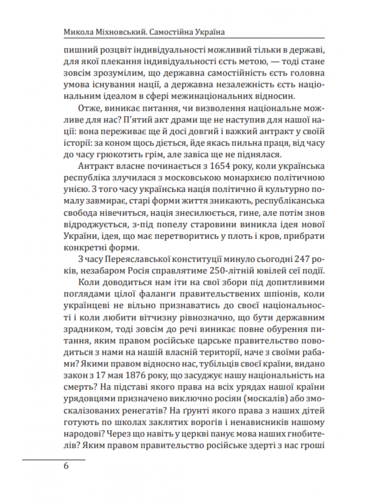 Твір торкається політичних, правових і філософських аспектів буття української нації та держави. Його значну частину становив екскурс до історії русифікаторської великодержавної політики царизму. Автор вважав за необхідне і правомірне повернення до статусу України, що існував на основі Переяславського трактату 1654 року.