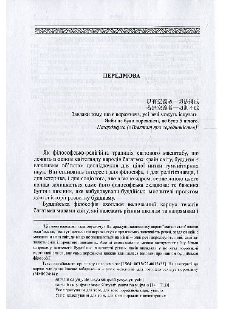 Ця книга є першим в Україні фундаментальним дослідженням з філософії буддизму. Водночас вона є першою у своєму роді спробою дослідити буддизм не як строкате розмаїття доктрин окремих шкіл та напрямків, а як живе, внутрішньо цілісне філософсько-релігійне вчення, що постає на базі спільної для всіх його напрямків філософії – філософії порожнечі.