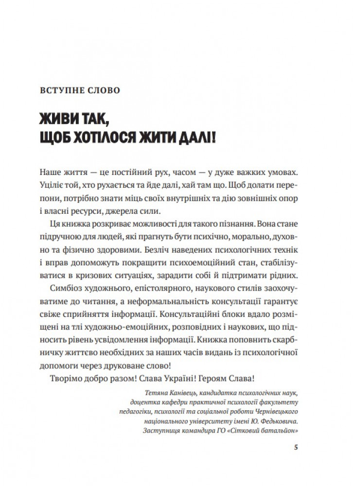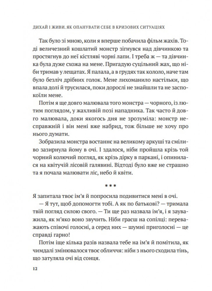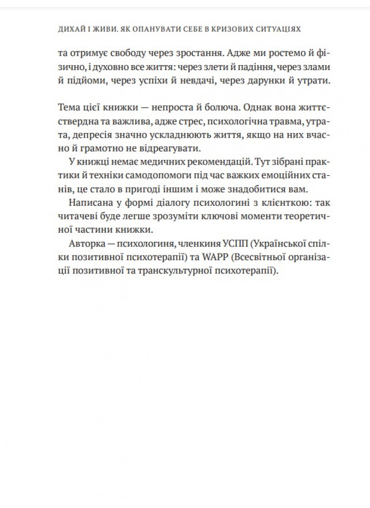 Посібник «Дихай і живи» повертає до життя через любов. До нормального життя. Попри війну. Ці ефективні психологічні техніки та вправи можна застосовувати, коли йдеться про тривогу, стрес, ПТСР, психологічну травму, втрату, провину вцілілого, депресивні стани. А що почасти книжку написано як діалог психологині з клієнткою, то замість нудьги від сухої теорії читач відчуває присутність у своєму житті психолога, з яким можна «на ти» і який запитує «Як ти?».
