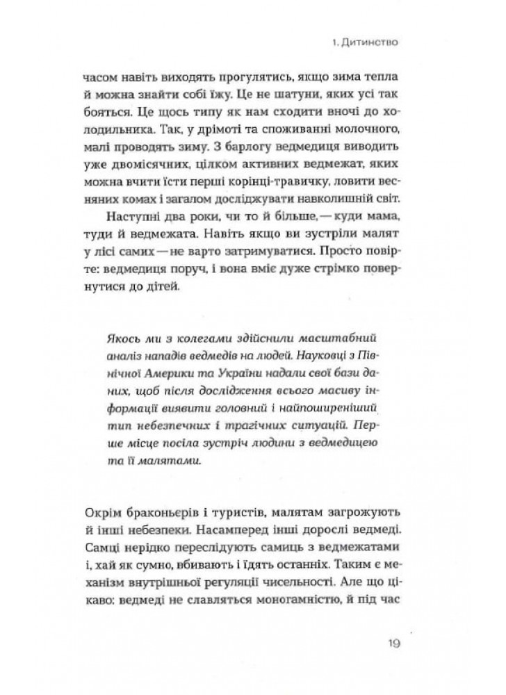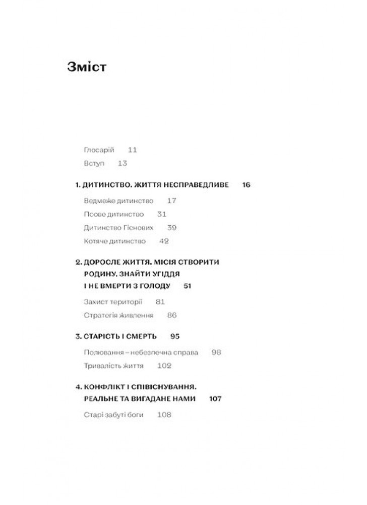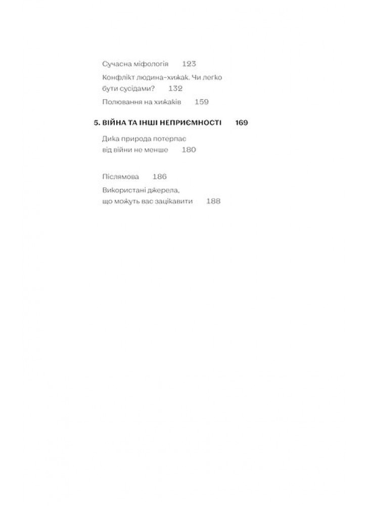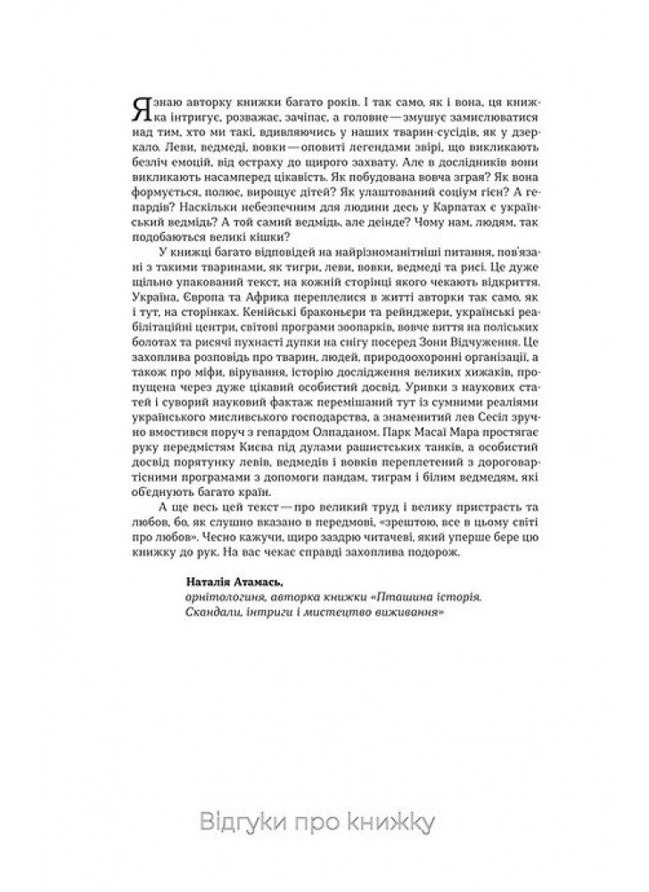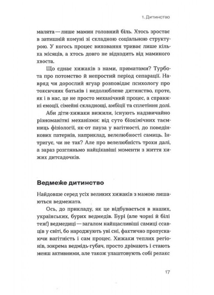 Чи справді ведмедиці народжують уві сні? Чому панди з Тайваню регулярно мандрують до Китаю і як порахувати вовченят, навіть не бачачи їх? Хто з хижаків справжній король сексу й чому гієни агресують щодо своїх же молодих самиць? Авторка розповість і про легендарних левів-людожерів, і про те, що робити, коли вам назустріч вийшов вовк чи ведмідь (маленький спойлер: краще віддати йому відерце з ягодами й не намагатися забрати впольовану здобич).