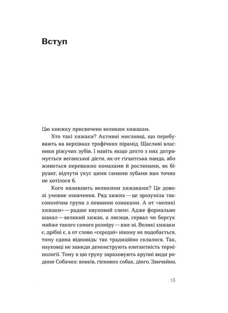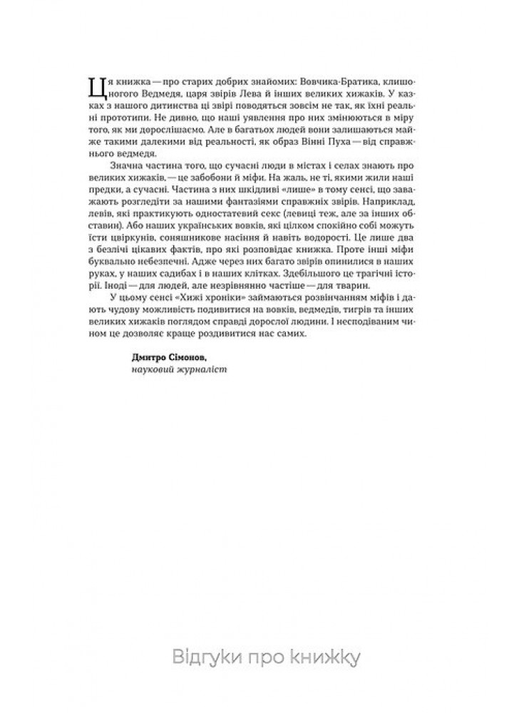Вовки вірні одне одному все життя, ведмідь на смак, як людина, а Поліссям десь бродить чупакабра. Такі історії ви можете почути скрізь, та, як це завжди трапляється із сенсаціями, вони не мають нічого спільного з реальними хижаками. Зоологиня Марина Шквиря у своїй книжці розповідає справжню історію великих хижаків — від ведмедів і левів до вовків та гієн.