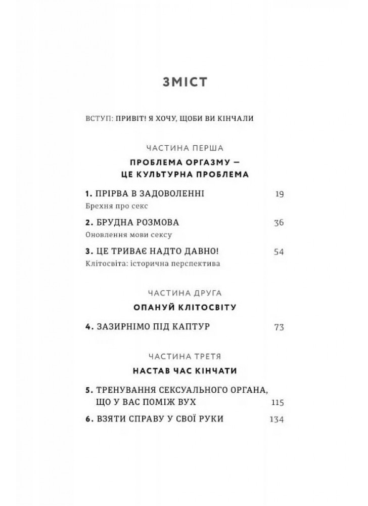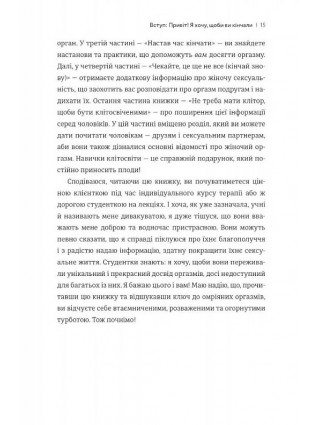 У ньому вона пояснює, чому так багато жінок не кінчають із партнерами, як з’ясувалось, причина в суспільстві, культурі і навіть мові. Вона також розповідає про найважливіший жіночий статевий орган і жіночу сексуальність, а головне – дає настанови та практичні поради, що допоможуть жінкам отримувати оргазми. Проте книжка не тільки для жінок, у ній є окремий розділ і для чоловіків.