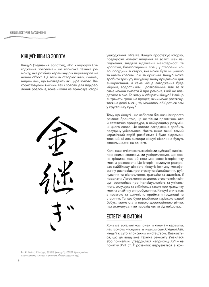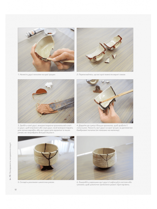 Кінцуґі — японське мистецтво лагодження розбитої кераміки лаком та золотом. Ця техніка вшановує історію предмета, адже замість маскування зламу, оприявлює його і робить красивим. Тож розбита річ стає ще ціннішою.Ця ілюстрована книга пояснює, що таке традиційне кінцуґі та як воно робиться.